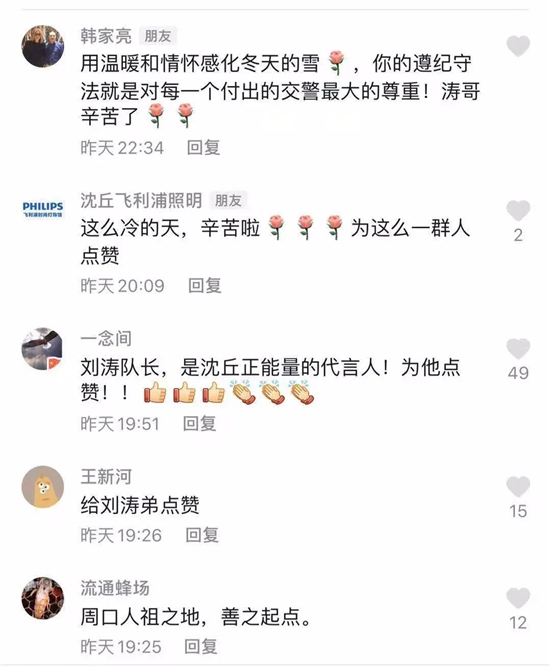 2021年元旦,記者聯(lián)系聯(lián)系上了視頻中的主人公——沈丘縣交警大隊(duì)城市中隊(duì)劉濤中隊(duì)長,雖然是元旦假日,他依然堅(jiān)守在崗位上,他告訴記者,這是一名交警工作的日常,沒有想到自己和同事們的一個(gè)小舉動能獲得無數(shù)網(wǎng)友好評,這給了他們在以后工作中更大的動力,劉濤表示,風(fēng)雪無阻,滾滾車流中,他將為全縣人民的安全出行繼續(xù)堅(jiān)守崗位。