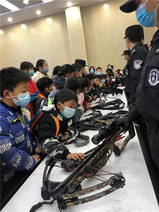 在指揮中心大廳,小記者們還有序參觀了現(xiàn)場展示的特殊警用裝備。除了手槍外,還有沖鋒槍、狙擊步槍、激光炫目槍和強(qiáng)力弓弩等。市公安局特警支隊(duì)民警向小記者們介紹了各種槍支及裝備的性能和使用方式,并邀請(qǐng)小記者觸摸一把警用槍械。