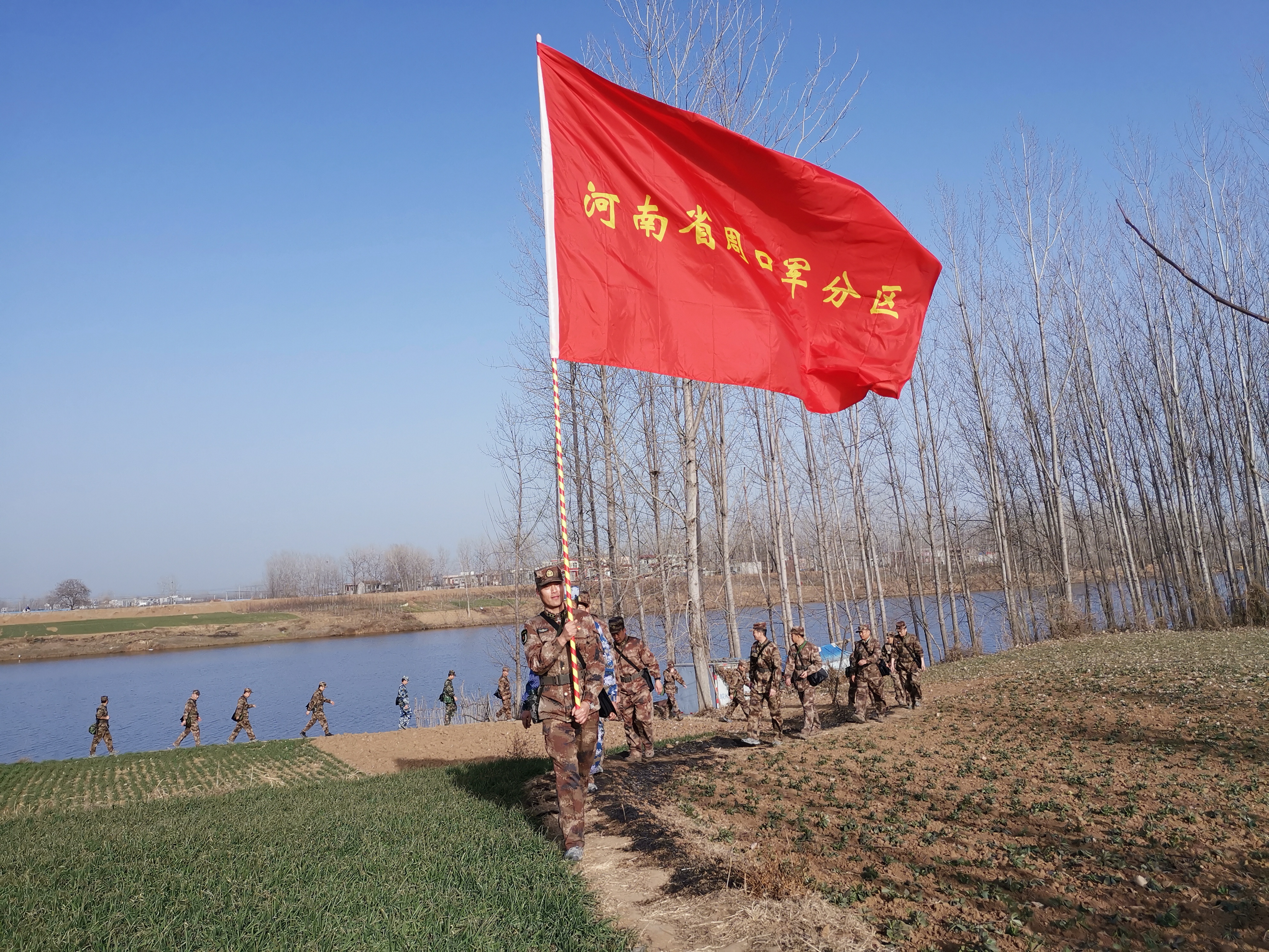 冬日暖陽(yáng)里,沙潁河畔,一群迷彩身影行走在蜿蜒曲折的沙河堤上。陽(yáng)光下,“河南省周口軍分區(qū)”的旗幟迎風(fēng)飄揚(yáng)。