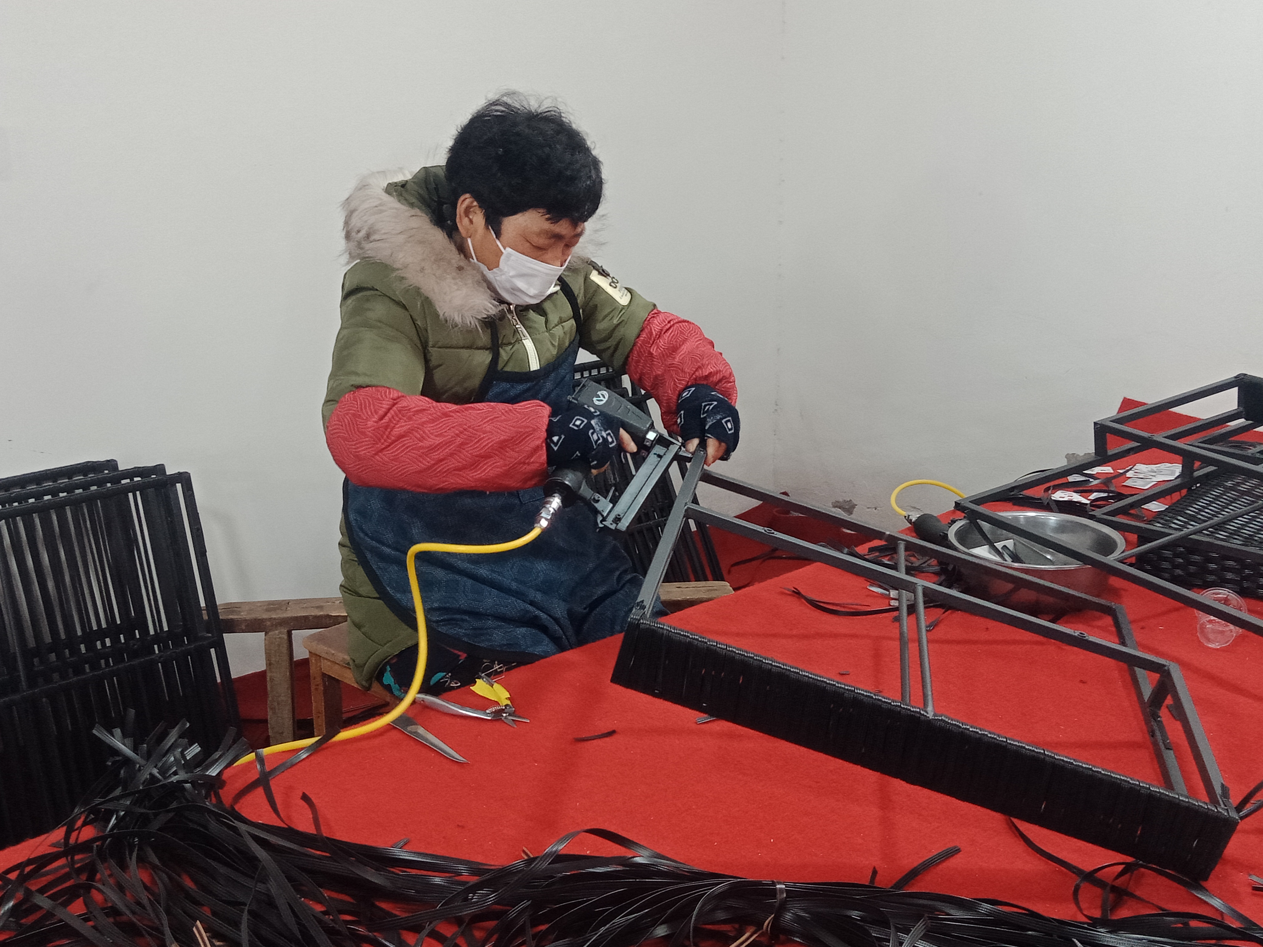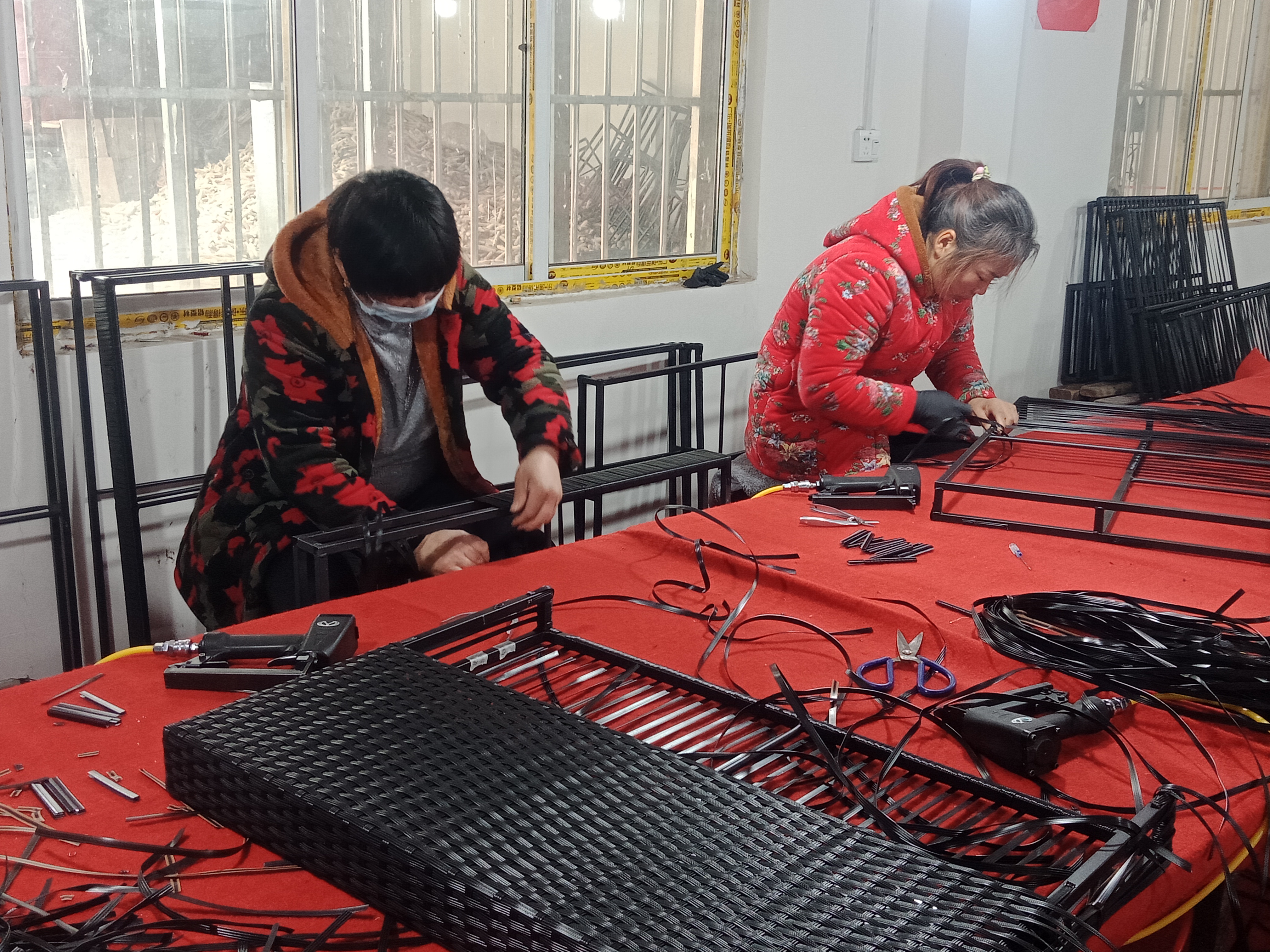在加工車間,記者看到十幾個(gè)中年婦女在不停忙碌著。有拉鋼的、有編織的,有收尾的,顯得很是輕松愉快。據(jù)說,熟練工每天可以加工十多個(gè)戶外藤編沙發(fā)雙面靠背,按件計(jì)算,平均每天能掙六七十元,多的可掙百元。