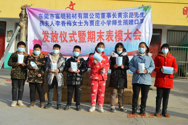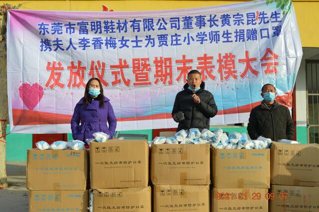 廣東省東莞市富明鞋材有限公司董事長黃宗昆先生及夫人李香梅女士原籍太康縣馬頭鎮(zhèn)薛廟村,他們得知寒假將至,正值師生、家長返鄉(xiāng)團(tuán)聚、走親訪友高峰時(shí)節(jié),當(dāng)前疫情防控面臨境外疫情持續(xù)爆發(fā)流行、國內(nèi)散發(fā)病例頻發(fā)的新情況、新挑戰(zhàn)。為了確保賈莊小學(xué)300多名師生生命安全和身心健康,以及他們近期疫情防控對口罩的需求,進(jìn)一步增強(qiáng)師生的防控意識,夫妻二人決定為該校捐贈3萬只一次性醫(yī)用口罩,以實(shí)際行動助力該校疫情防控工作。