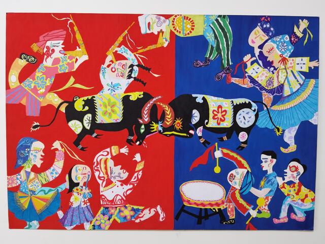 2020年4月,錢玉燕無意中看到“決勝全面小康”第二屆全國農(nóng)民畫展覽征稿啟事,對農(nóng)村生活非常熟悉的她決定一試。她立足于周口平原農(nóng)區(qū)的特色,深深領(lǐng)悟周口幾千年來的農(nóng)耕文化,對參賽作品進行了認真、系統(tǒng)地構(gòu)思,最終決定以歡慶豐收的斗牛活動為題材,把農(nóng)耕文化的深遠、厚重與豐富的藝術(shù)表現(xiàn)手法相融合。她采用普通的繪畫卡紙,運用多種繪畫顏料,充分借鑒漢畫藝術(shù),吸收中原地區(qū)的剪紙文化、西方藝術(shù)大師畢加索立體畫派的藝術(shù)風(fēng)格和古埃及畫的靈感,以艷麗的紅、藍為主背景,采取夸張的表現(xiàn)手法,把斗牛的場景表現(xiàn)得淋漓盡致。作品創(chuàng)作發(fā)揮了豐富的想象力,人物動物造型借鑒中國民間藝術(shù)剪紙的方式表現(xiàn),以大膽、夸張、強烈的色彩搭配,把無限深廣的空間“壓扁”到一個平面上。
