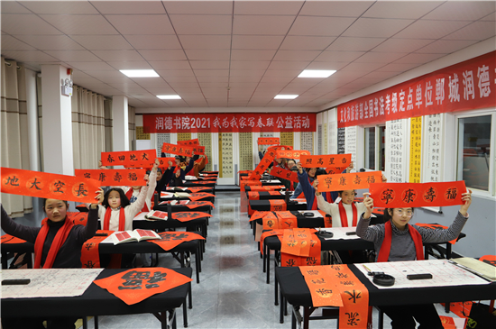 迎春節(jié)、寫春聯(lián)、送福字、賀新年,已經(jīng)成為中華民族新春佳節(jié)的不可或缺的節(jié)日元素。鄲城縣作為中國書法之鄉(xiāng),寫書法春聯(lián)的氛圍更顯濃郁,書法家送春聯(lián)到基層,書法愛好者和書法學(xué)員掀起了“我為我家寫春聯(lián)”的熱潮,把書法文化和傳統(tǒng)文化融合浸透到萬千家庭。