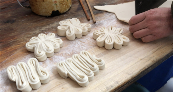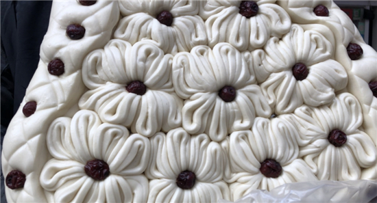 除了平常的白面饅頭,黃師傅還讓妻子現(xiàn)場展示了“棗山”制作,并介紹了棗山的寓意和習俗?!澳憧催@棗山是一層一層的,寓意著步步登高,而且棗山的花形是圓的,代表著團團圓圓。過去出嫁的閨女過年回娘家要帶大饃,娘家要回棗山,現(xiàn)在咱們周口的一些地方還保留著這樣的習俗?!眱晌恢鞑ンw驗了棗山的制作過程,得到黃老板妻子的夸獎:“中!這倆妮兒可巧!”