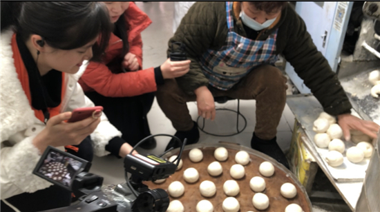過大年,蒸饅頭。當日9時許,在項城市,兩位主播唱起中國傳統(tǒng)年俗童謠,隨后走進一家饅頭店現(xiàn)場直播年饃制作過程。饅頭店老板姓黃,從事饅頭制作30余年,直播開始即見轟鳴的和面機攪動著巨大的白面團,黃老板介紹說,這次和的面有130余斤,”以前是人工揉面,一個壯勞力一次揉40來斤面就不錯了?,F(xiàn)在機器揉面除了揉的多,而且快,還越揉越白,不像人工揉面越揉越黑。機器揉面越揉越勁道,做出來的饃好吃,我們這兒現(xiàn)在全機械化制作“。