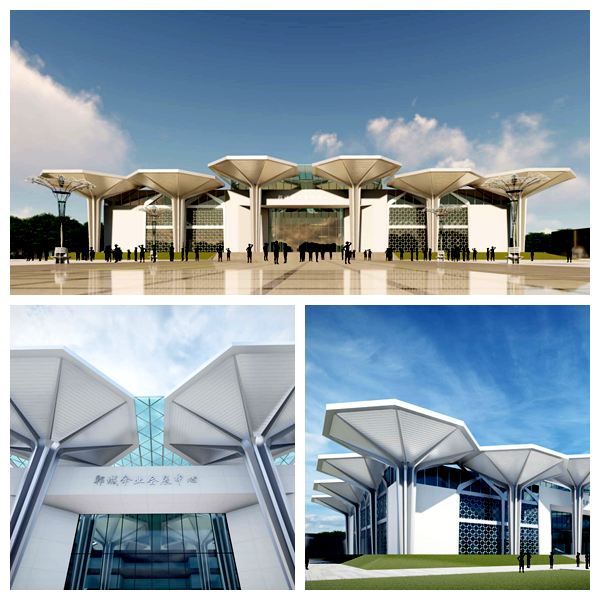 其中,傘業(yè)產(chǎn)業(yè)園電子商務(wù)服務(wù)中心項(xiàng)目由中國(guó)一冶承建,會(huì)展中心的設(shè)計(jì)概念以“傘啟鄲興”為主題,基于對(duì)本土特色文化的深入解讀、同時(shí)結(jié)合“傘”的具體特征,提煉傘蓋、傘骨、傘柄的特殊形象為基本元素。建筑主立面以八個(gè)巨大傘形構(gòu)架依次展開(kāi),巨型的尺度、新穎的造型有極強(qiáng)的昭示性,裝飾幕墻八邊形的單元分割也隱喻了傘蓋的造型,創(chuàng)新的視覺(jué)形象為傘業(yè)產(chǎn)業(yè)園增加了新的注解。會(huì)展中心整體的建筑風(fēng)格充分展示了鄲城傘業(yè)產(chǎn)業(yè)園的核心價(jià)值,形成獨(dú)具特色的地標(biāo)形象。