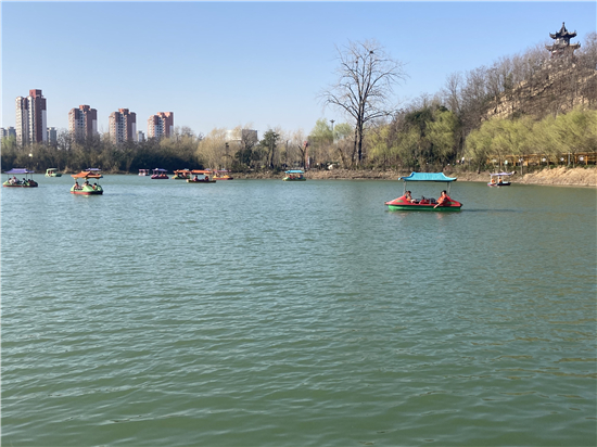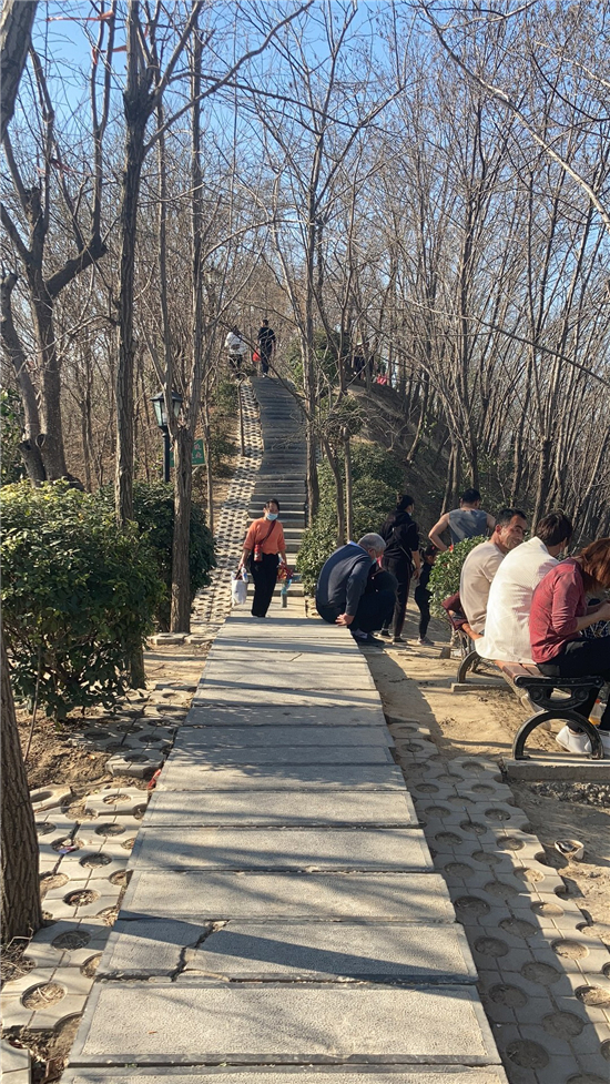 在槐香湖邊,年輕人三五結(jié)伴登上游艇,“坐船能到湖那邊的小島,島上也有槐樹,拍照肯定特別漂亮。”返鄉(xiāng)大學(xué)生把七星島上的景色留在了自己的相機(jī)里。七星島與槐香湖相連的橋上,人潮擁擠,有的人席地而坐,觀賞著橋上的風(fēng)景。當(dāng)問道在外市工作的王先生游玩感受時,他回答到:“年后上班沒時間鍛煉身體,今天我把全家人帶來登山,呼吸一下新鮮空氣?!雹?