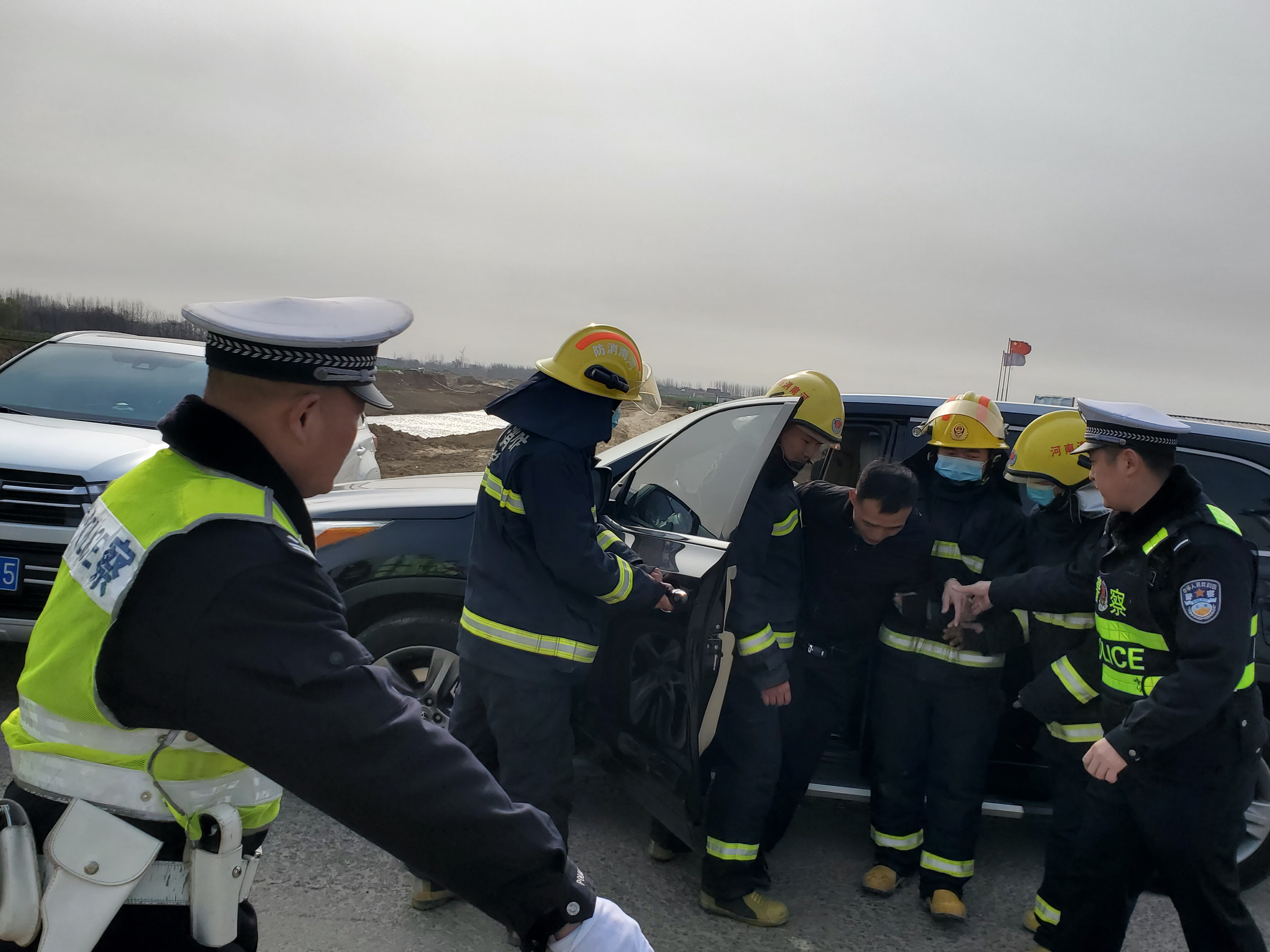 演練模擬2月23日10許,在G220國道河南安徽二省交界友誼橋處,二輛越野車在道路中心線處相撞,二輛車駕駛?cè)祟^部受傷流血,車門被卡,車輛起火冒煙道路嚴(yán)重?fù)矶?、情況危急。接到報警后,交警部門立即向上級進(jìn)行匯報,“四位一體”聯(lián)動工作機(jī)制隨即啟動,相關(guān)部門迅速趕往現(xiàn)場開展事故處置和救援工作。同時會同交警、屬地派出所,消防救援、醫(yī)療救護(hù)部門一起協(xié)助開展相關(guān)工作。隨后事故民警按照現(xiàn)場勘查要求,迅速對現(xiàn)場進(jìn)行勘查、拍照,提取相關(guān)證據(jù),配合搶險、醫(yī)療施救各部門,并對現(xiàn)場遺留物品進(jìn)行清理、登記并妥善保管。勘查結(jié)束后交警部門解除警戒區(qū),將車輛疏導(dǎo)、分流完畢后撤離現(xiàn)場。