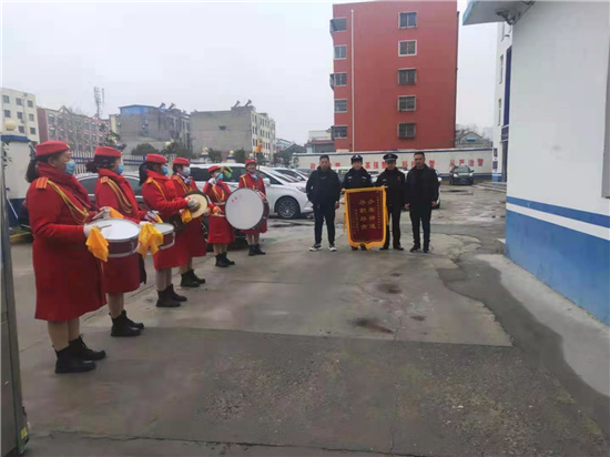2月25日上午,項城市公安局水寨派出所門口鑼鼓齊鳴,異常熱鬧,兩名男子手持一面寫有“辦案神速、盡職盡責”字樣的錦旗,送給派出所民警,深表謝意。