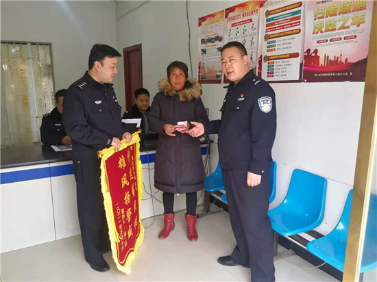 2月27日上午,一名群眾將寫著“神速解民憂 雄風(fēng)揚(yáng)警威”錦旗送到川匯公安分局荷花路派出所民警手中,感謝民警們的辛苦付出。錦旗背后的故事還得從一條抖音說起。