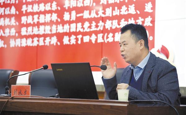 2月26日下午,商水縣舉行學(xué)黨史國史紅色教育大講堂活動(dòng)。商水籍北大學(xué)子劉水龍結(jié)合史料,精彩講述賀龍北伐在商水播下革命火種、彭雪楓經(jīng)周口東進(jìn)豫皖蘇燃起商水革命烈火、豫皖蘇軍區(qū)解放周口商水浴火重生,以及火熱革命中涌現(xiàn)出來的商水英烈艾力、趙海靜,支前模范徐乃貞等人的英勇事跡。這些生動(dòng)鮮活的歷史人物故事,再現(xiàn)了英雄兒女在商水大地上勇于革命、不怕犧牲的紅色革命歷史。劉水龍用豐富的史實(shí)、鮮明的觀點(diǎn)、精辟的講述,贏得臺(tái)下聽眾陣陣掌聲。記者 付永奇 攝
