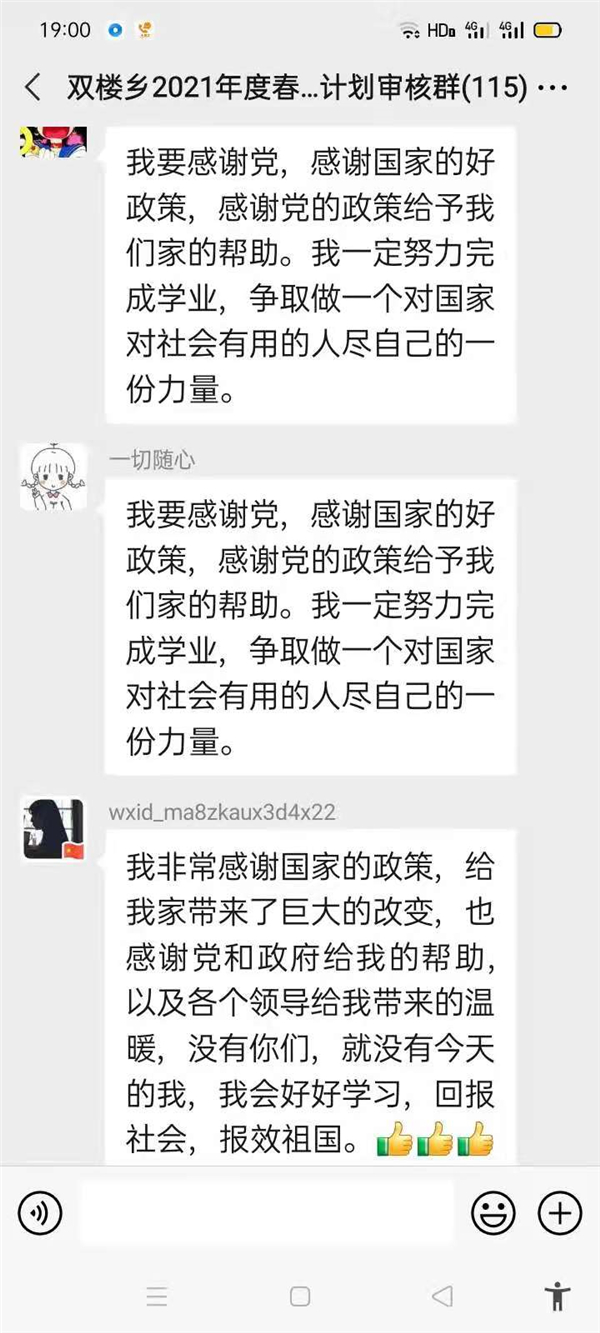 “感謝幫助過我家的所有幫扶人,沒有你們,就沒有我家今天的幸福生活,我們光榮脫貧了,作為貧困家庭中新成長勞動力,我一定珍惜這次來之不易的學習機會,好好學習技術,畢業(yè)后回村成為一名技術帶頭人,來促進家鄉(xiāng)產(chǎn)業(yè)的發(fā)展?!编惓强h雙樓鄉(xiāng)孫莊村脫貧學生張素華在微信群里說。近幾天,鄲城縣雙樓鄉(xiāng)114人的大學生微信群里可熱鬧了,在鄉(xiāng)黨委政府的引導下,該鄉(xiāng)眾多脫貧后的大學生通過鄉(xiāng)里建起的微信群,紛紛圍繞“話脫貧、感黨恩、奮進新時代”這一主題交流思想,提振斗志。
