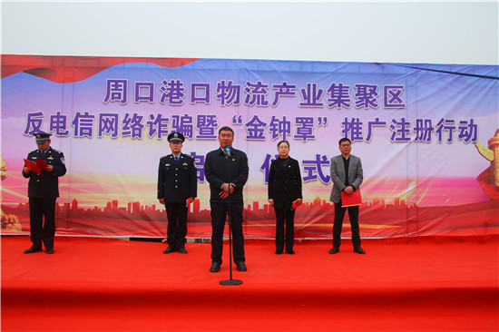 為打擊治理電信網(wǎng)絡(luò)詐騙犯罪,降低詐騙案件發(fā)生率,4月13日,周口港區(qū)舉辦反電信網(wǎng)絡(luò)詐騙宣傳暨“金鐘罩”推廣注冊行動啟動儀式,宣傳反電詐知識,推廣公安部門推出的反詐騙系統(tǒng)平臺“金鐘罩”。港區(qū)黨委書記孫鵬到場宣布行動正式啟動,港區(qū)黨委委員、紀委書記李素芹,公安分局局長康群泉在儀式上講話。