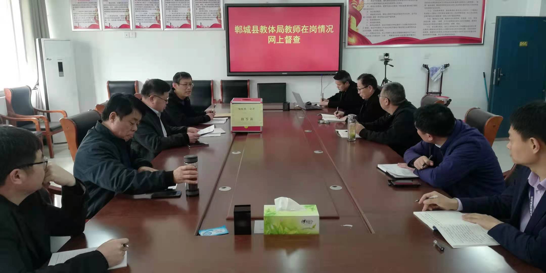 抽查時(shí),紀(jì)檢組、督導(dǎo)室、辦公室、人事股、目標(biāo)辦等相關(guān)股室負(fù)責(zé)人和工作人員全部到崗到位,從抽簽箱中隨機(jī)抽出三個(gè)球號組成一組數(shù)字,然后從《隨機(jī)抽查檢查對象名錄庫》中確定被督查學(xué)校。網(wǎng)上督查人員接通被督查學(xué)校負(fù)責(zé)人或者教職工“企業(yè)微信”,通過視頻形式督查教師在崗信息公示情況、教師到崗情況、平時(shí)學(xué)校(中心校)對教師管理教育情況等,并同步與人事(師訓(xùn))教職工(特崗教師)信息系統(tǒng)比對。出差、請假等須當(dāng)場提供相關(guān)佐證材料。對疑似存在問題的,紀(jì)檢、人事部門當(dāng)即啟動線下復(fù)核程序。