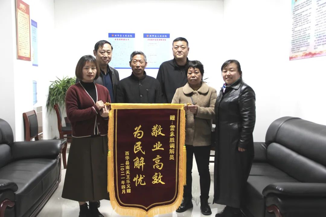 “要不是雷調(diào)解員出面調(diào)解,我的錢(qián)還不知道什么時(shí)候能要回來(lái)呢,這可幫了我們大忙……”4月13日上午,當(dāng)事人王某將一面印有“敬業(yè)高效 為民解憂(yōu)”的錦旗送至西華縣法院政協(xié)委員調(diào)解員雷永勝手中,對(duì)其耐心高效的調(diào)解工作表示衷心感謝。
