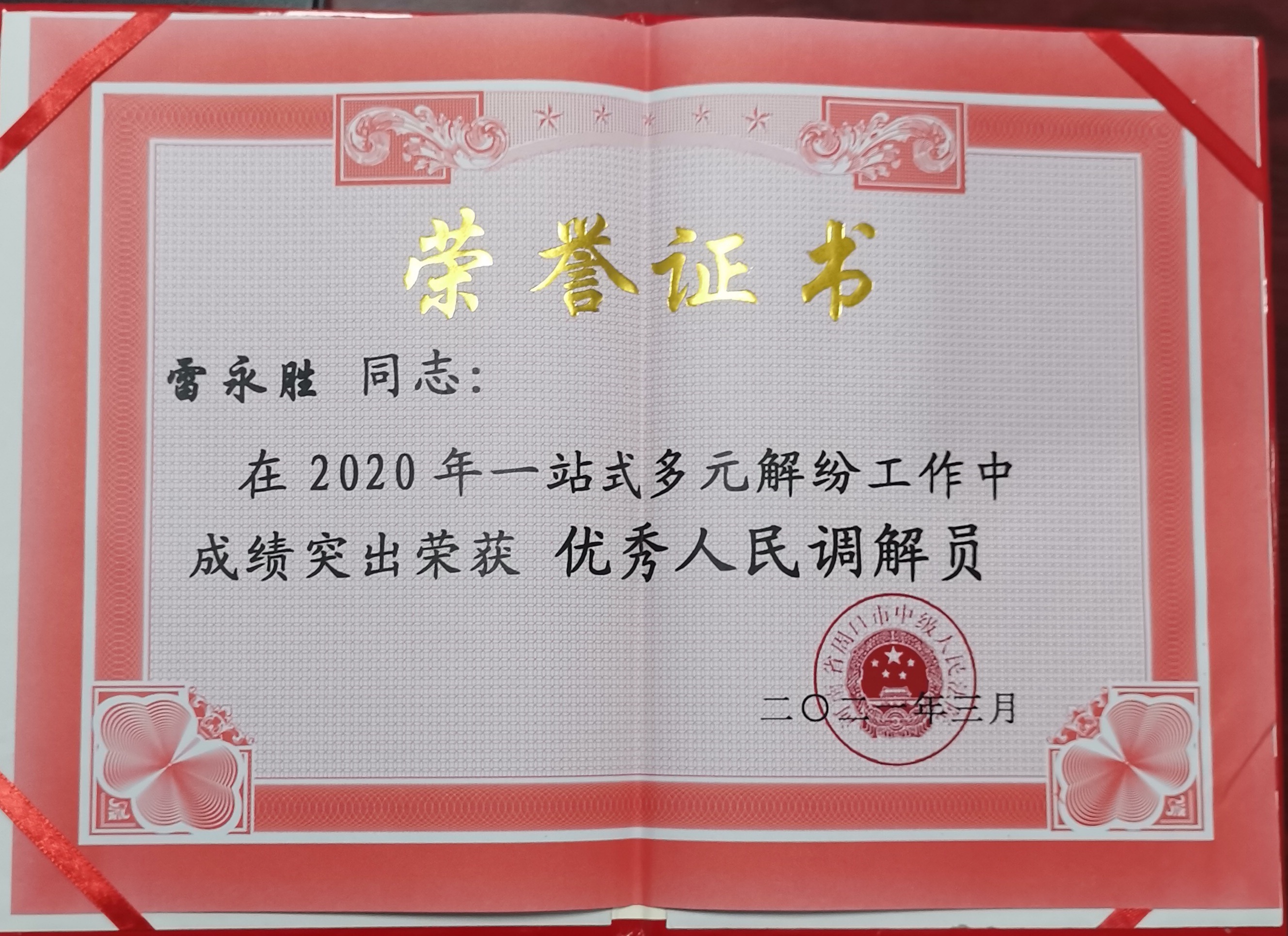 自2020年5月以來(lái),雷永勝調(diào)解員已累計(jì)接受各類(lèi)案件近200件,成功調(diào)解近百件,助力法院訴前調(diào)解工作邁入先進(jìn)行列,化解了大量社會(huì)矛盾,為維護(hù)社會(huì)和諧穩(wěn)定作出了積極貢獻(xiàn)。日前,雷永勝被周口市中級(jí)法院評(píng)為“2020年度優(yōu)秀人民調(diào)解員”。