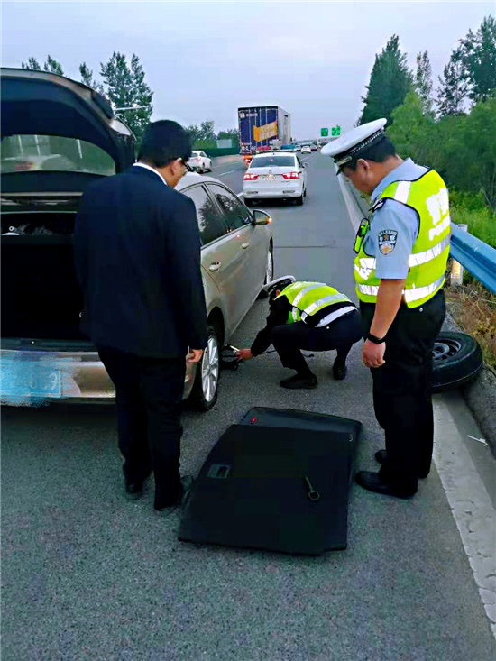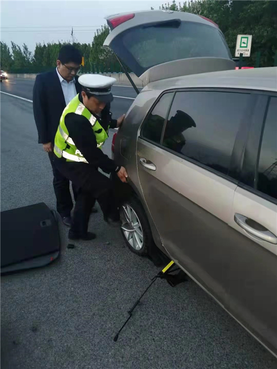 5月2日19時許,市公安局交通管理支隊高速二大隊項城中隊(以下簡稱高速二大隊項城中隊)民警由北往南方向巡邏途中,行駛到2081公里附近西半幅處,發(fā)現一輛轎車因車后輪爆胎,被迫停在應急車道,民警隨即幫助該車主更換車載備胎,解決了司機的燃眉之急。