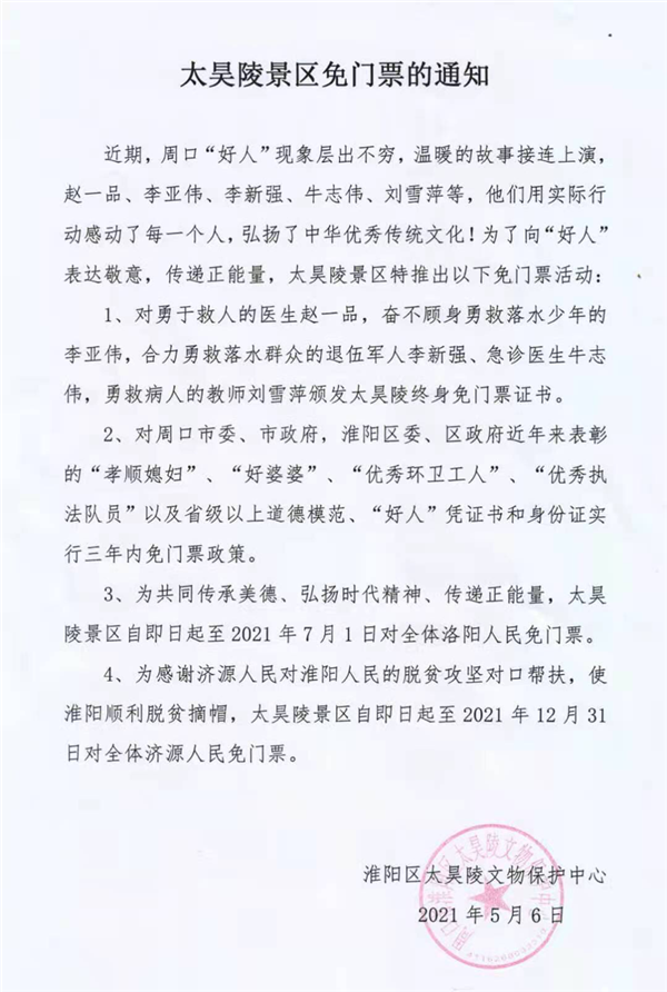 同時,為共同傳承美德、弘揚時代精神、傳遞正能量,太昊陵景區(qū)自即日起至2021年7月1日對全體洛陽人民免門票;為感謝濟(jì)源人民對淮陽人民的脫貧攻堅對口幫扶,使淮陽順利脫貧摘帽,太昊陵景區(qū)自5月6日起至2021年12月31日對全體濟(jì)源人民免門票。②7