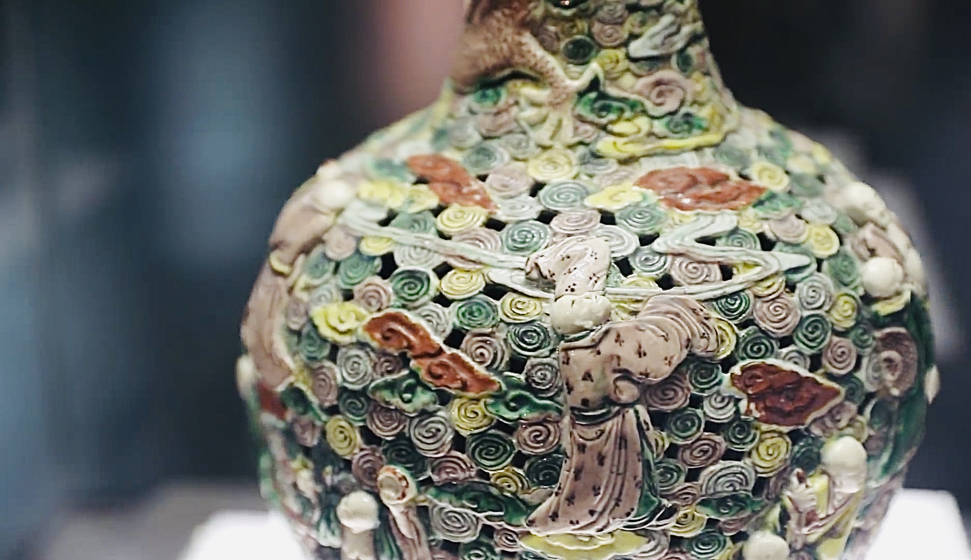 我的出生地在景德鎮(zhèn),但渾身上下又布滿了西亞佛教元素??炜?,紅、粉、綠、黃的云朵像玫瑰花一樣緊緊簇擁在一起布滿我全身,成了我漂亮的衣裳,人稱五彩祥云。祥云以浮雕、透雕、淺刻等技法,鏤空凹凸,層層交錯,立體感十足,像是3D版萬紫千紅的花海世界,吸引了十八羅漢來嬉戲打鬧,笑的皺紋都出來了。他們三五成群湊在一起,形態(tài)各異,栩栩如生。他們面額飽滿,鼻寬且豐,兩眼微閉,兩唇微翕,欲言又止,神態(tài)悠然自得,表情異常生動,衣紋隨風飄揚、流暢自如、富有動感,整個畫面和諧美好,像身處世外桃源,又如身臨仙境天堂。