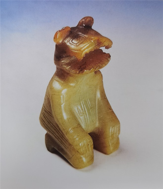 出土的玉器中,有一件玉人造型奇特、古怪。該玉人為虎首,出土于墓主人身側(cè)。半圓形雙耳,大口暴張,利齒猙獰,上下各七齒,長(zhǎng)圓形雙目,虎視眈眈?;㈩^以下為人身形象,體向前傾,跽坐,雙手扶膝,五指向下,未露足趾似著鞋,身著衣。背面呈蹲狀,圓目突睛,虎之雙耳亦為耳,人背作身,人的兩臂作之雙翼,人之兩足作足。昂首挺胸,怒視前方。