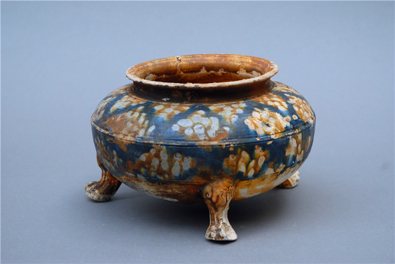 1998年10月,沉睡許久的唐藍(lán)釉三彩爐迎來了它的今世。周口市農(nóng)村信用社在建工地上,發(fā)現(xiàn)了一座唐代墓葬。在其中沉睡的唐藍(lán)釉三彩爐被吵醒,來到了它的新家——周口市博物館。它敞口,圓唇,短立徑,弧肩,鼓腹,下有三獸蹄足支撐它站立,樣貌圓潤飽滿,與唐代藝術(shù)豐滿、健美、闊碩的特征是一致的。唐藍(lán)釉三彩爐不僅體現(xiàn)了唐代人的制陶工藝和智慧,更是絲綢之路與中西文化和物資交流融合的見證,渾身散發(fā)歷史與藝術(shù)的魅力。