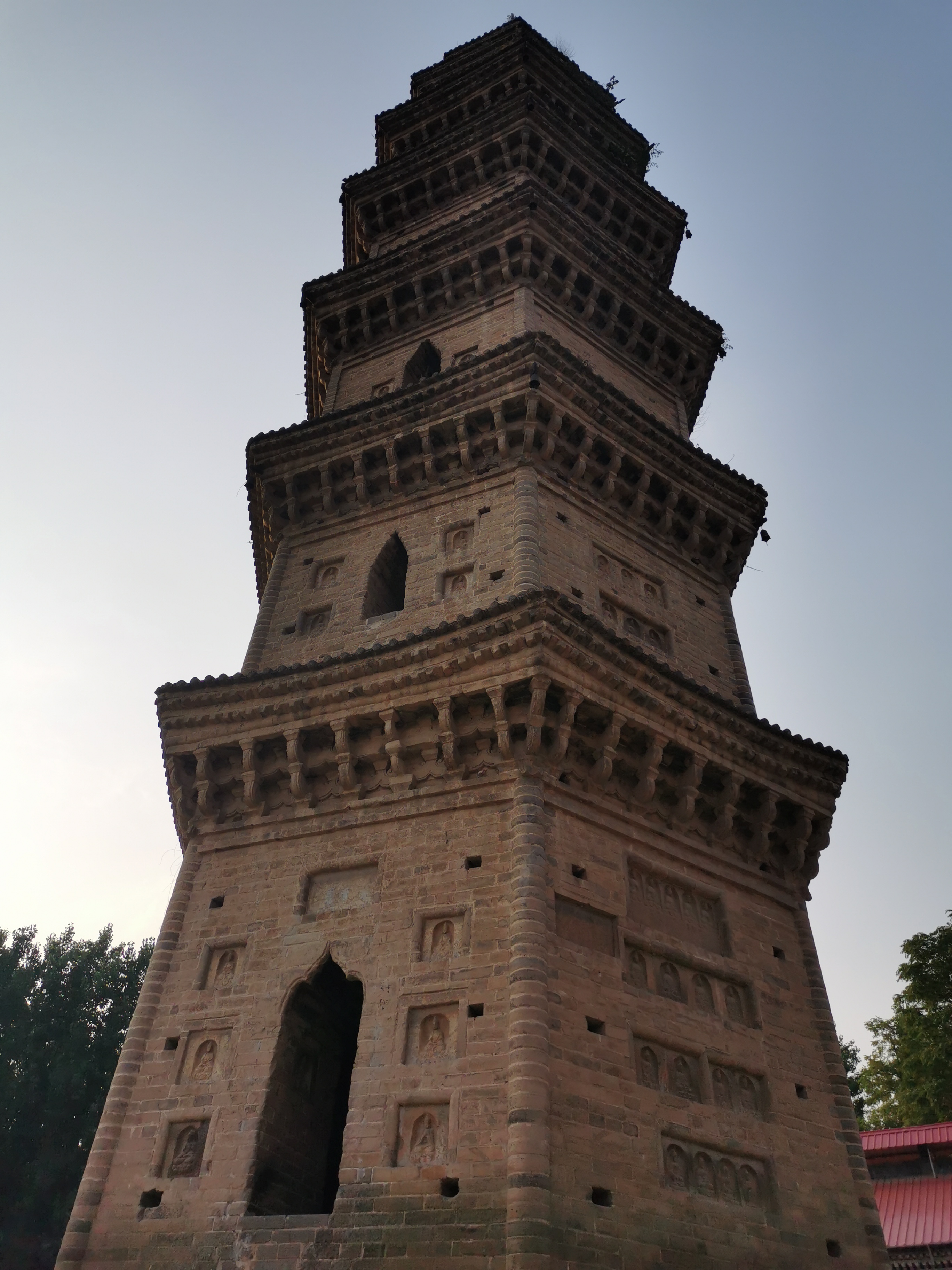 太康壽圣寺塔,高28.3米,為六角形七級(jí)樓閣式磚塔,上有塔剎。塔身第七層為實(shí)心,一至六層為空心,但層與層相隔互不相通,在南面辟圭形門,檐下均置磚雕斗拱。塔身南面正墻除第七級(jí)外均有真門,每層檐下都飾有磚雕斗拱,塔身共嵌砌石雕佛像211尊、石刻題記14方。