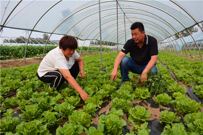 圖一:7月13日, 王爭林、張翠夫婦正在查看大棚生菜長勢。