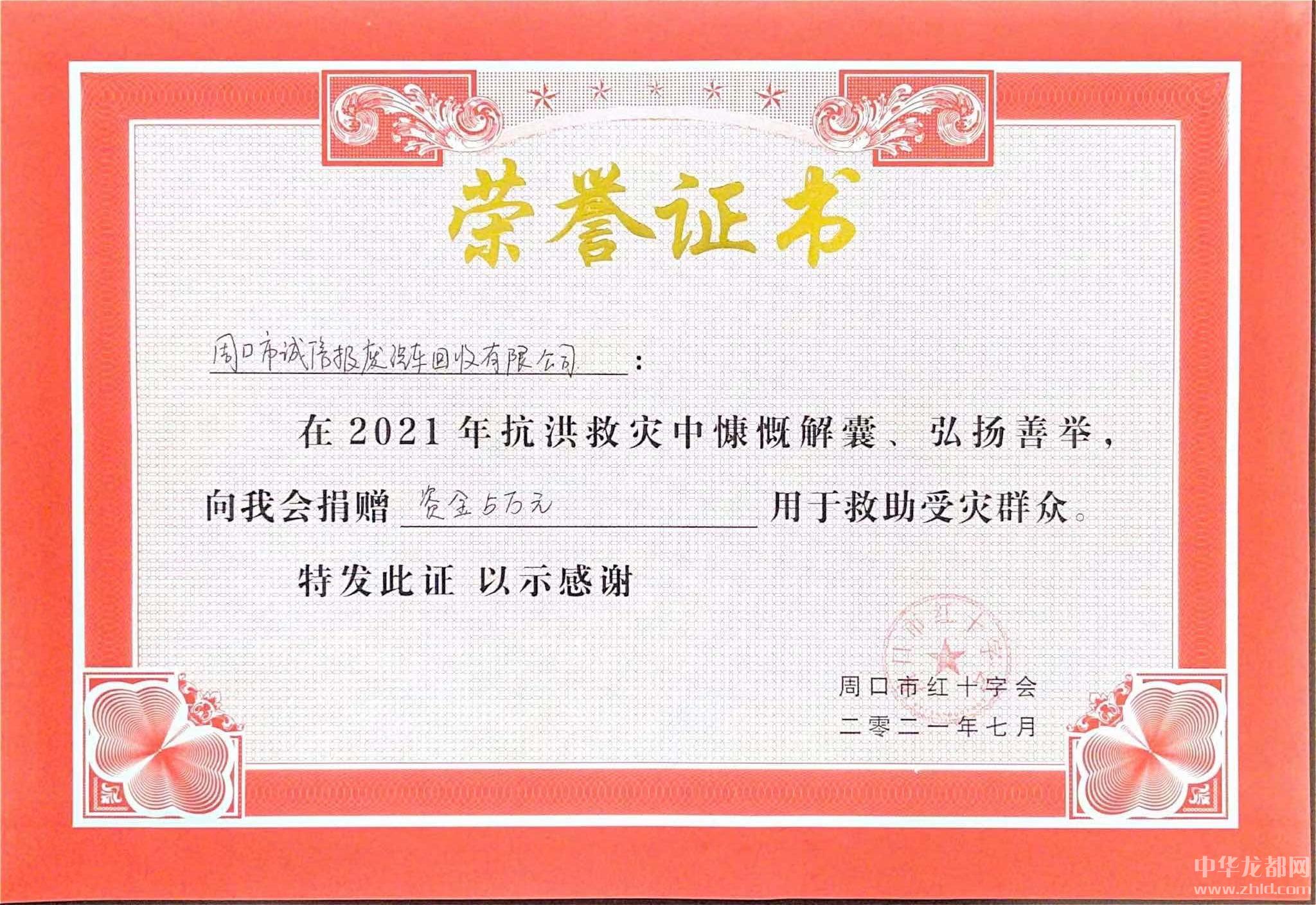 同時,張站國作為周口市誠信報廢汽車有限公司負(fù)責(zé)人,為切實履行企業(yè)的社會責(zé)任,周口市誠信報廢汽車有限公司于2021年7月27日向周口市紅十字會捐贈現(xiàn)金人民幣5萬元,用于防汛救災(zāi)、群眾幫扶、衛(wèi)生防疫和災(zāi)后重建工作。