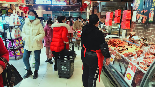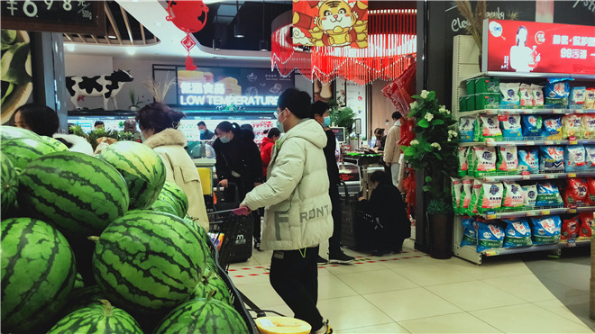 春節(jié)將至,我市各大超市處處是濃濃的年味。1月26日,記者走進(jìn)我市中心城區(qū)各大超市發(fā)現(xiàn),超市內(nèi)熙熙攘攘,生鮮果蔬區(qū)域消費(fèi)者尤多,絕大多數(shù)消費(fèi)者自覺(jué)佩戴口罩。②11
