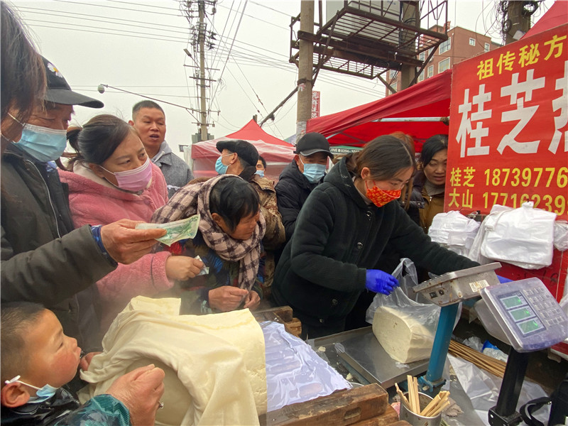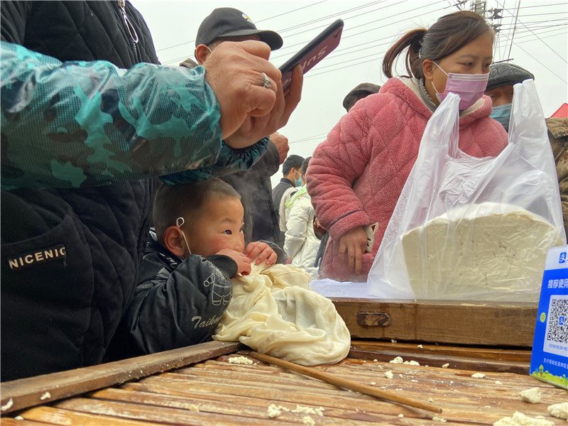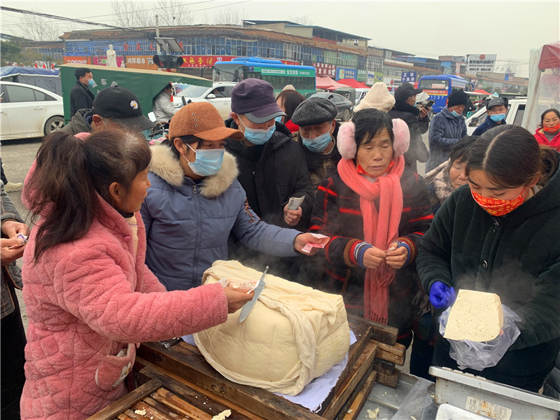在固墻鎮(zhèn)的集市上,“桂枝熱豆腐”攤位前的顧客絡(luò)繹不絕。“給我來50塊錢的豆腐”“我要20斤,先給我切豆腐吧”“我要30斤,多少錢”……人群將豆腐攤里三層外三層圍了起來,從人群外朝里看看不見豆腐,只看到豆腐攤里冒出來的團(tuán)團(tuán)熱氣?!暗攘税雮€小時了,剛才那一盒豆腐沒輪到我就賣完了,這才搶到手?!备浇拇迕駰畲鬆斈弥鴦傎I的豆腐高興地說?!拔覐穆挂貋淼?,姐姐在里面擠著買豆腐,我在這兒等她呢?!?歲的張家瑞說,她每年放寒假都會和家人一起到固墻來探親,過年的時候逛逛集市,順便買些豆腐帶回鹿邑。