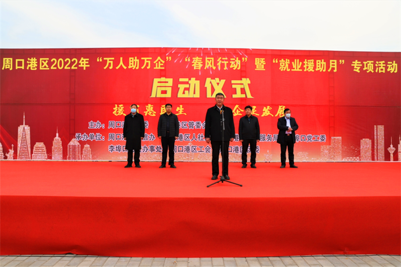 2月22日,周口港區(qū)舉辦2022年“萬人助萬企”“春風(fēng)行動(dòng)”暨“就業(yè)援助月”啟動(dòng)儀式,通過舉辦一系列活動(dòng),為企業(yè)和求職者牽線搭橋。港區(qū)黨委書記孫鵬宣布啟動(dòng)儀式開幕,管委會(huì)主任胡軍華在儀式上致辭,港區(qū)領(lǐng)導(dǎo)杜廣賢、劉學(xué)慶、李素芹參加活動(dòng)。