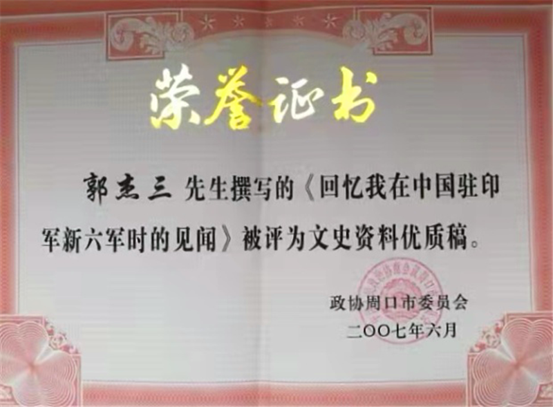 2005年9月3日,時任中共中央總書記、國家主席、中央軍委主席胡錦濤發(fā)表了《在紀(jì)念中國人民抗日戰(zhàn)爭暨世界反法西斯戰(zhàn)爭勝利60周年大會上的講話》,正視了正面戰(zhàn)場國民黨軍隊抗戰(zhàn)的歷史。之后,父親才給我講述他遠(yuǎn)征抗日的經(jīng)歷,并撰寫了《回憶我在中國駐印軍新六軍時的見聞》一稿,刊登在2007年《周口文史資料》上。政協(xié)為表彰父親的貢獻(xiàn),特別頒發(fā)了“文史資料優(yōu)質(zhì)稿”獎狀。