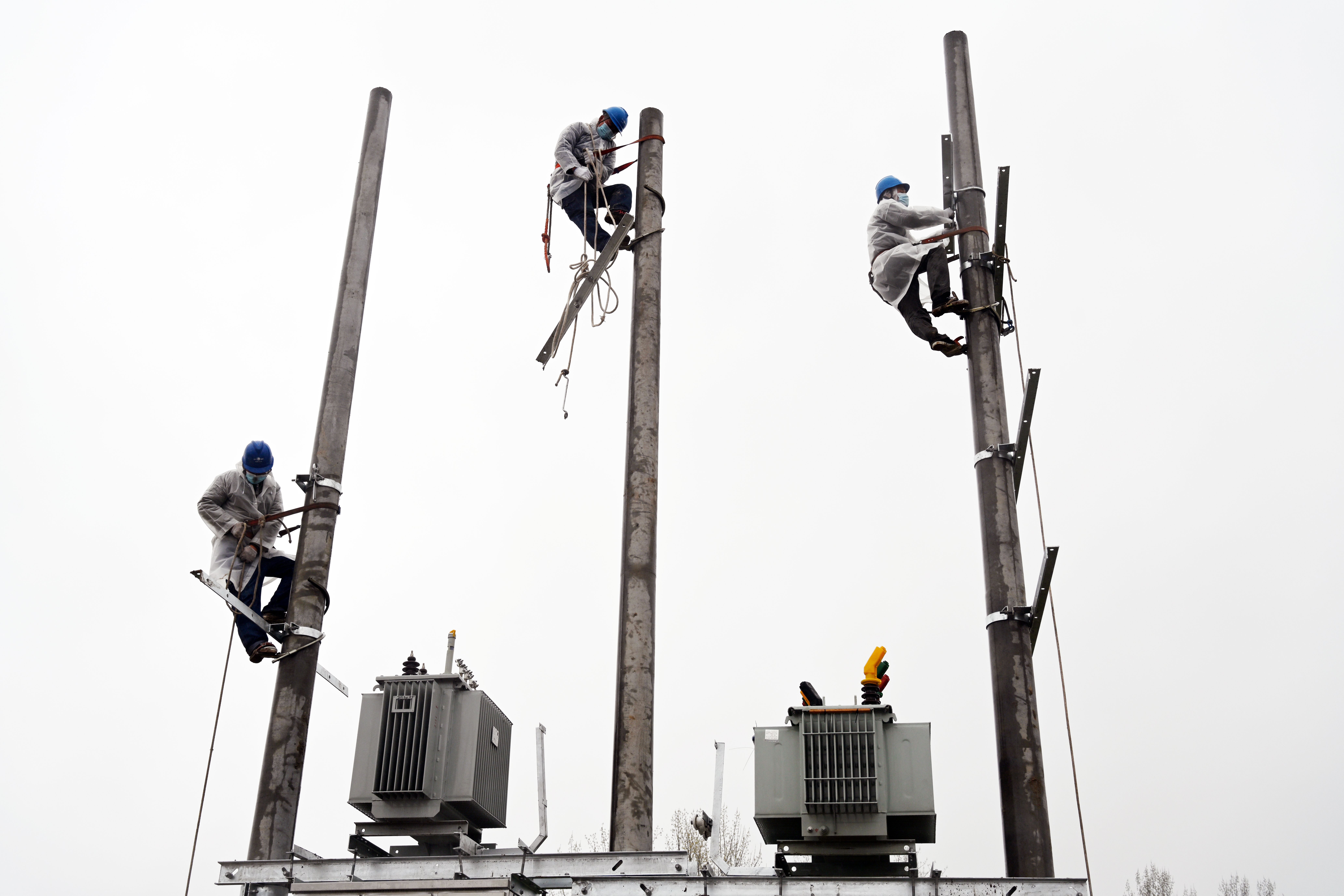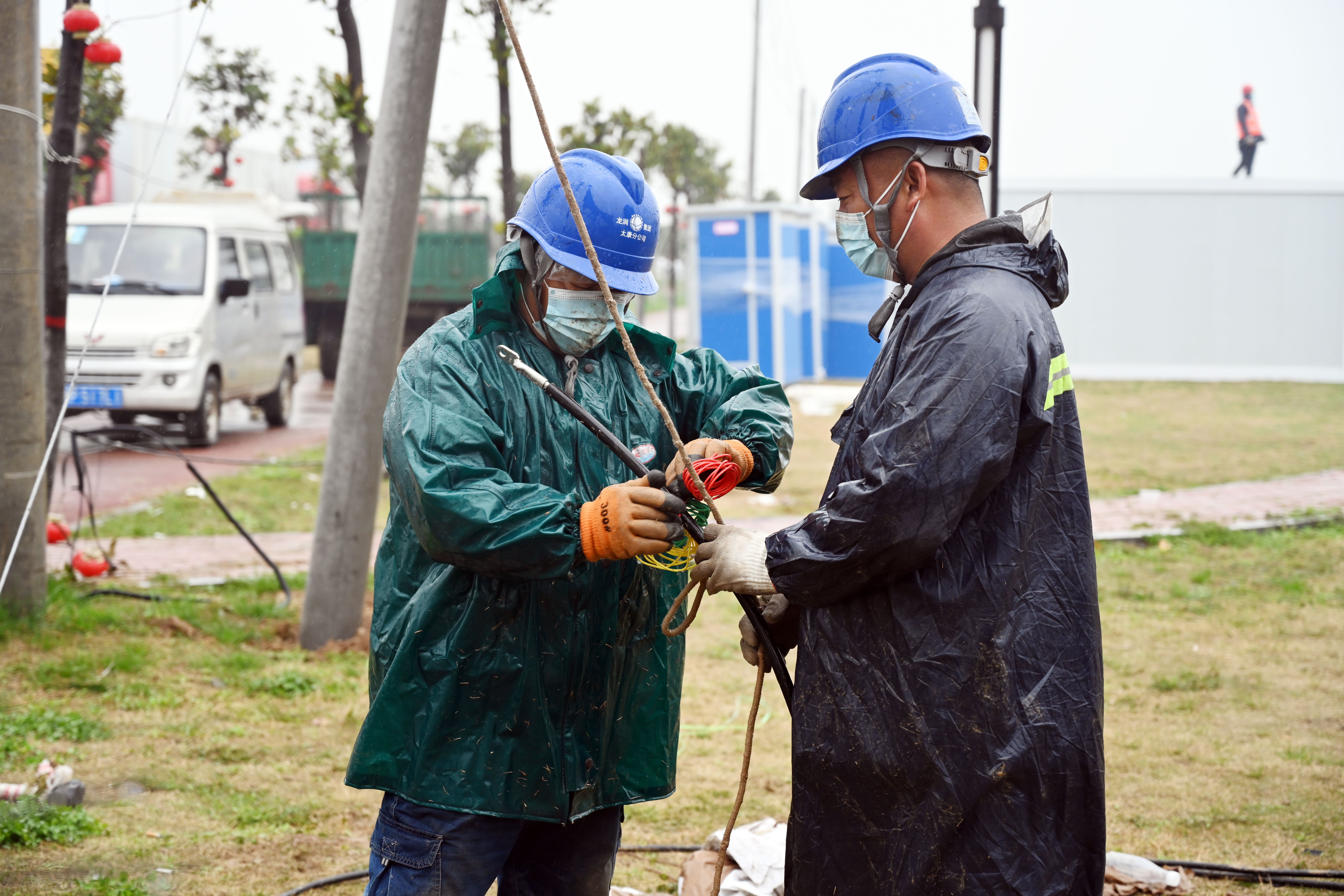 3月25日,在太康縣北環(huán)路核酸檢測方艙和隔離方艙建設現(xiàn)場,國網太康縣供電公司工作人員正冒雨施工為其提供電力保障。