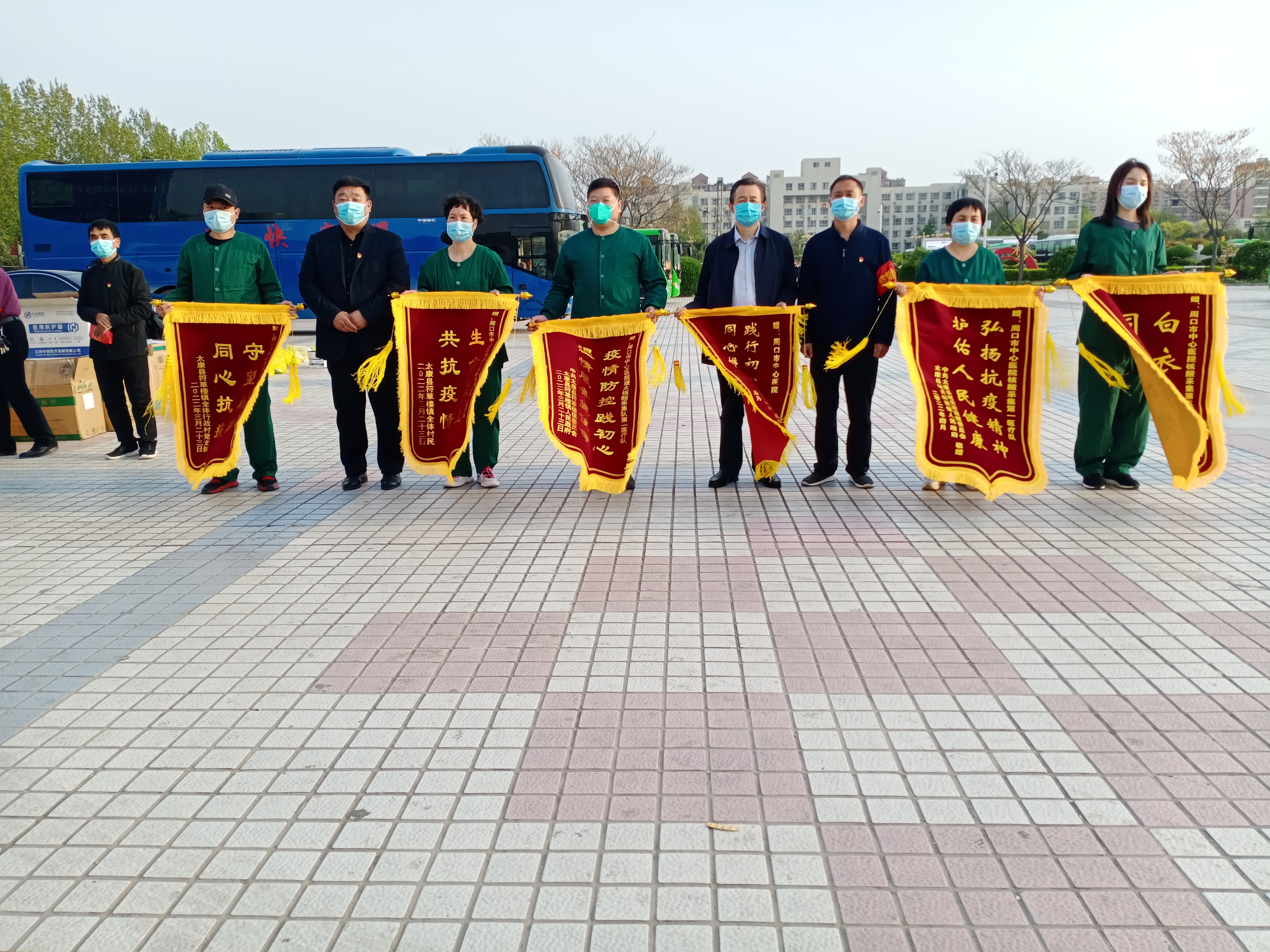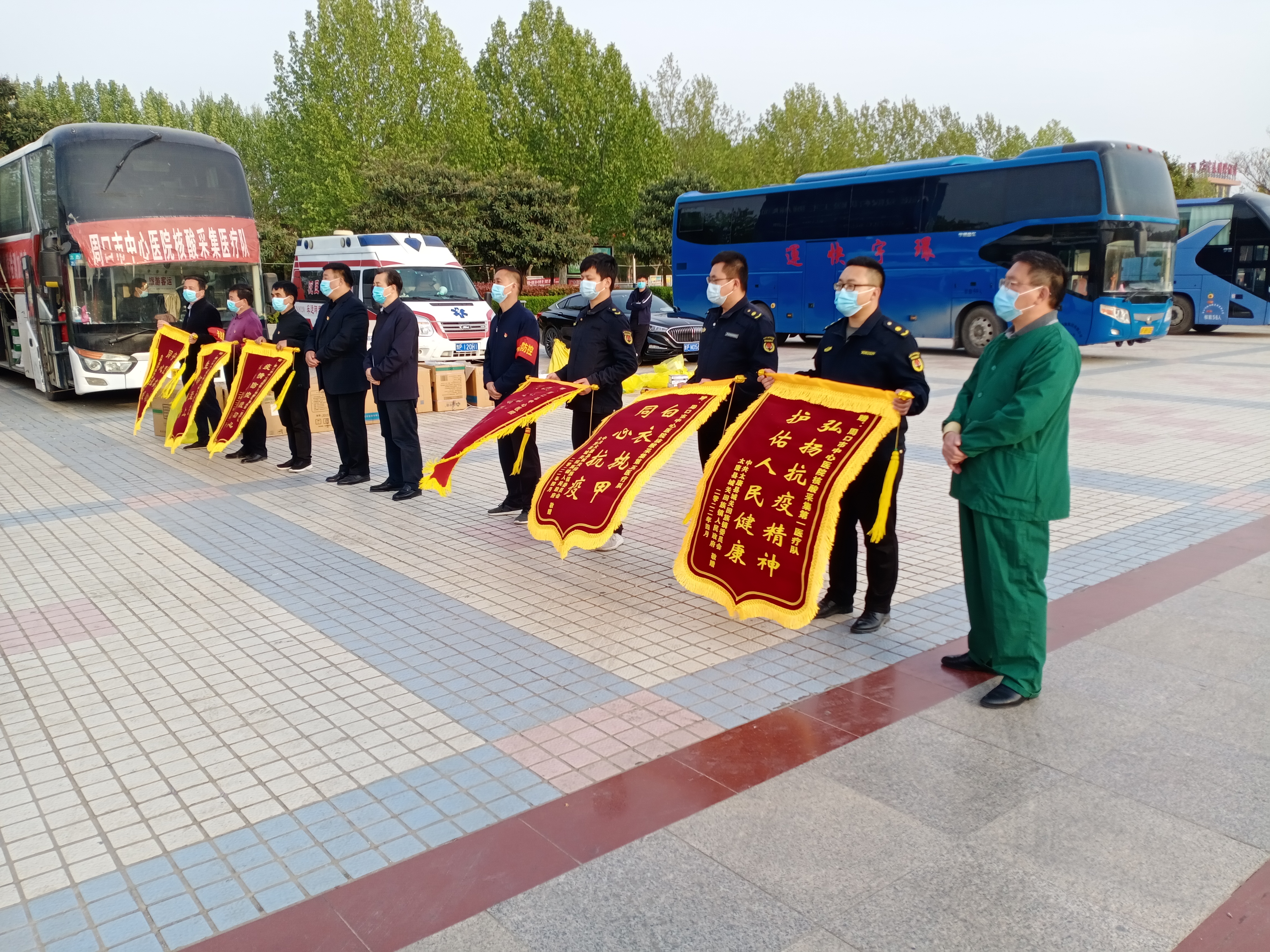 日前,太康縣城關(guān)鎮(zhèn)、符草樓鎮(zhèn)相關(guān)負(fù)責(zé)人將寫有“白衣執(zhí)甲 同心抗疫”“弘揚(yáng)抗疫精神 護(hù)佑人民健康”“守望相助 同心抗疫”字樣的錦旗送到前來支援太康縣的周口市中心醫(yī)院醫(yī)務(wù)人員手中,感謝他們的無私幫助。③6 記者 張洪濤 攝