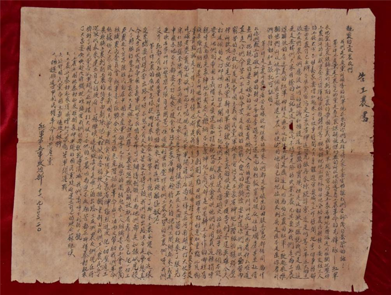 1928年7月22日,彭德懷領(lǐng)導(dǎo)湘軍獨立第五師第一團等部于湖南省平江城起義。不久,部隊即奉命改編為中國工農(nóng)紅軍第五軍第十三師。1930年6月,紅五軍在湖北省大冶縣編入紅三軍團。根據(jù)《紅軍第五軍政治部告工農(nóng)書》的落款時間及內(nèi)容可以看出,此布告落款時間為1930年3月20日,它是研究紅五軍開展農(nóng)民工作、宣傳工作和紅五軍光輝歷史的重要史料佐證。