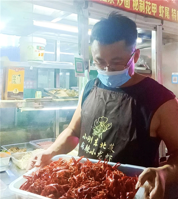 此時,在“東北小剛”麻辣小龍蝦夜攤前,已經(jīng)擺放好了幾張桌子,三五成群的客人相繼前來落座??腿它c餐后,只見攤主“小剛”就站在操作臺前,手腳麻利地將提前準(zhǔn)備好的小龍蝦等菜品一一裝盤,然后送到客人面前,忙得不可開交。