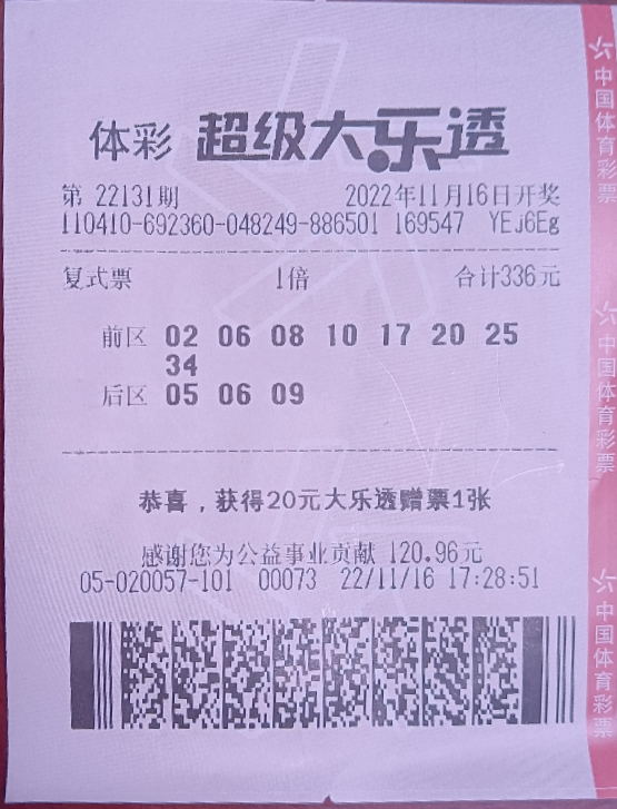 11月16日,體彩大樂透第22131期開獎(jiǎng),開獎(jiǎng)號(hào)碼為:前區(qū)02、06、08、10、17,后區(qū)05、06。本期通過2.80億元銷量,為國(guó)家籌集彩票公益金1.01億元。本期全國(guó)開出13基本投注一等獎(jiǎng),單注獎(jiǎng)金723萬(wàn)元,分落河南(3注)、浙江(2注)、福建(2注)、云南(2注)、河北、黑龍江、山東、湖北。第22131期開獎(jiǎng)后,獎(jiǎng)池滾存10.23億元。
