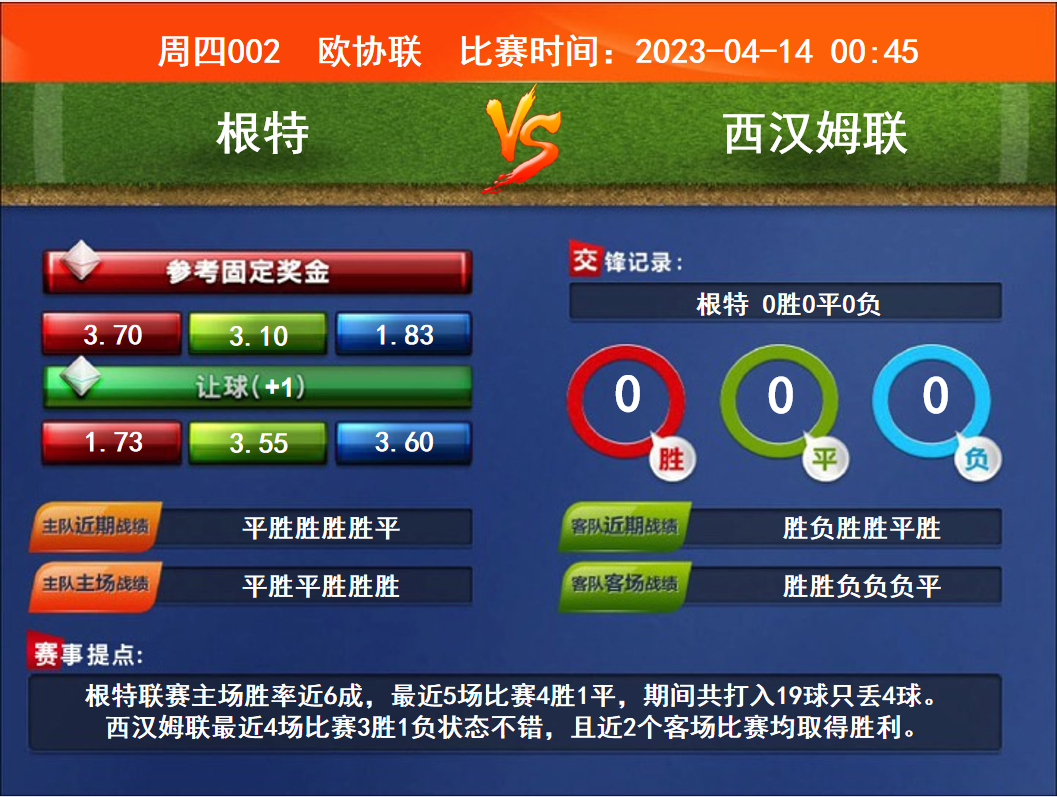 比賽時間:2023-04-14 00:45賽事提點(diǎn):根特聯(lián)賽主場勝率近6成,最近5場比賽4勝1平,期間共打入19球只丟4球。西漢姆聯(lián)最近4場比賽3勝1負(fù)狀態(tài)不錯,且近2個客場比賽均取得勝利。