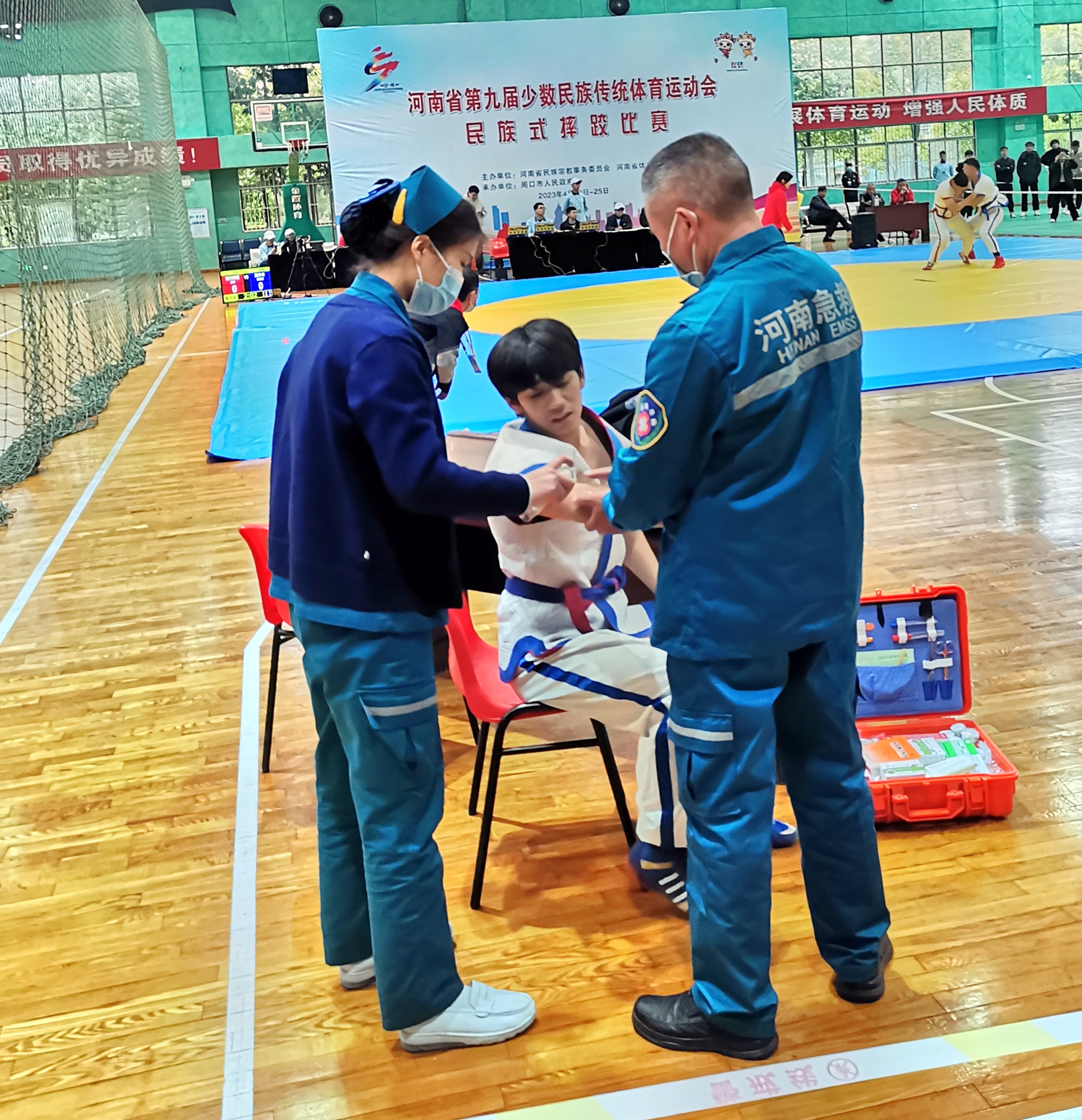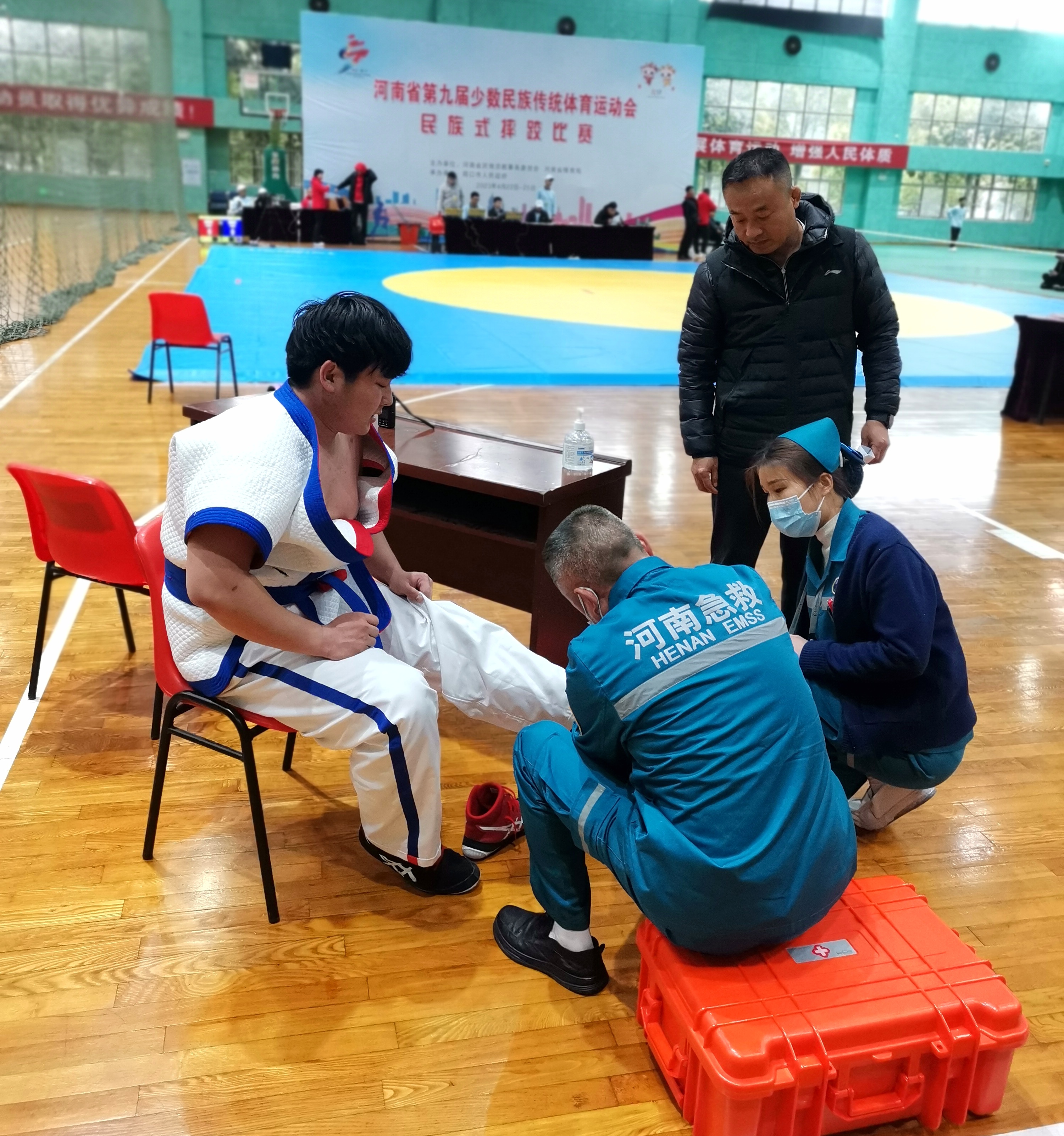 4月22日至26日,河南省第九屆少數(shù)民族傳統(tǒng)體育運(yùn)動會在周口市舉辦。為確保來賓、運(yùn)動員、教練員、技術(shù)官員等參會人員的醫(yī)療衛(wèi)生安全,周口市衛(wèi)生健康部門全面調(diào)動全市醫(yī)療資源,建立覆蓋各競賽項目及指定接待賓館的醫(yī)療救治、衛(wèi)生監(jiān)督、防疫消殺等醫(yī)療保健服務(wù)體系,認(rèn)真完善各項工作方案、預(yù)案,制定細(xì)化工作流程,為省運(yùn)動會提供及時有效、熱情周到的醫(yī)療衛(wèi)生保障服務(wù)。圖為運(yùn)動員在比賽中受傷,現(xiàn)場保障的醫(yī)護(hù)人員迅速處置。