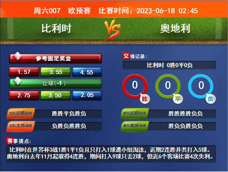 比賽時(shí)間:2023-06-18 02:45賽事提點(diǎn):比利時(shí)在世界杯3戰(zhàn)1勝1平1負(fù)且只打入1球遭小組淘汰,近期2連勝并共打入5球。奧地利自去年11月起取得4連勝,期間打入9球只丟2球,但近6個(gè)客場(chǎng)比賽4次失利。