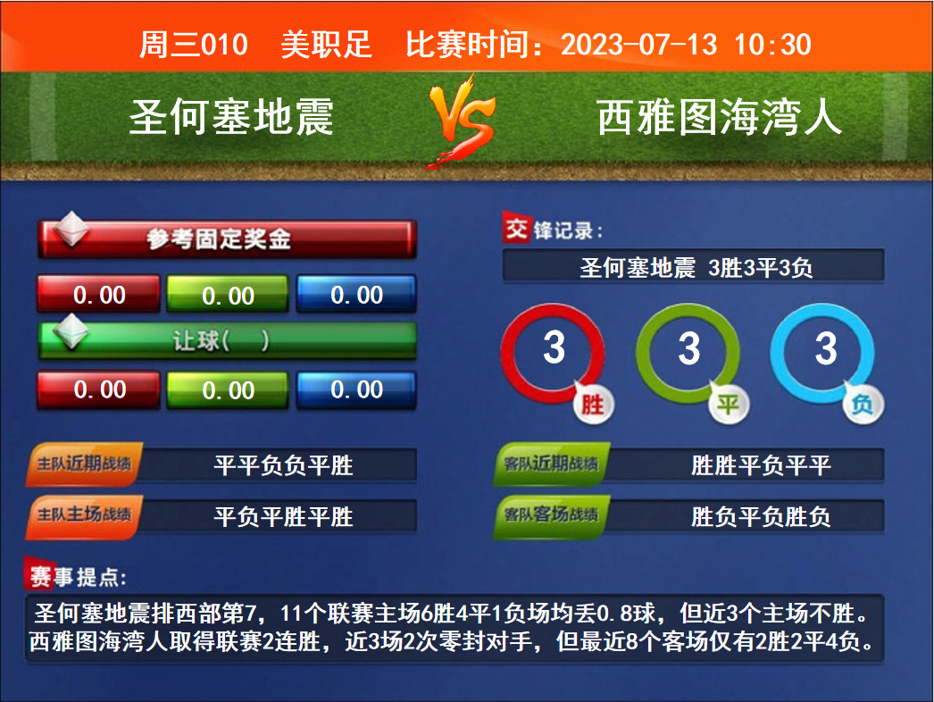 比賽時間:2023-07-13 10:30賽事提點(diǎn):圣何塞地震排西部第7,11個聯(lián)賽主場6勝4平1負(fù)場均丟0.8球,但近3個主場不勝。西雅圖海灣人取得聯(lián)賽2連勝,近3場2次零封對手,但最近8個客場僅有2勝2平4負(fù)。
