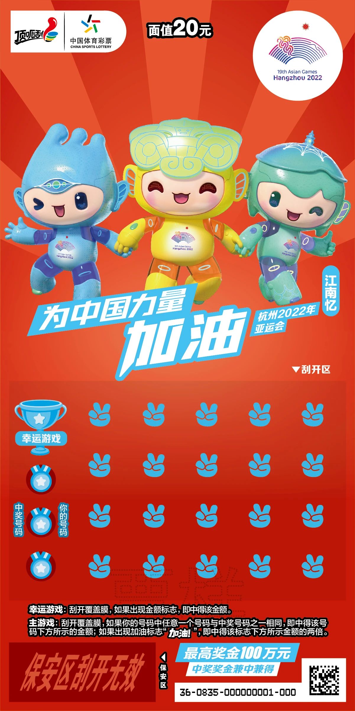 在杭州亞運(yùn)會(huì)開幕倒計(jì)時(shí)200天之際,浙江體彩推出“為中國(guó)力量加油”杭州亞運(yùn)會(huì)主題即開型體育彩票,票面以亞運(yùn)會(huì)吉祥物“琮琮”“蓮蓮”“宸宸”為主體形象,將具有親和力的吉祥物與充滿活力的網(wǎng)球、游泳、籃球、乒乓球等體育運(yùn)動(dòng)相結(jié)合,以動(dòng)感時(shí)尚形式展示亞運(yùn)會(huì)賽事項(xiàng)目。
