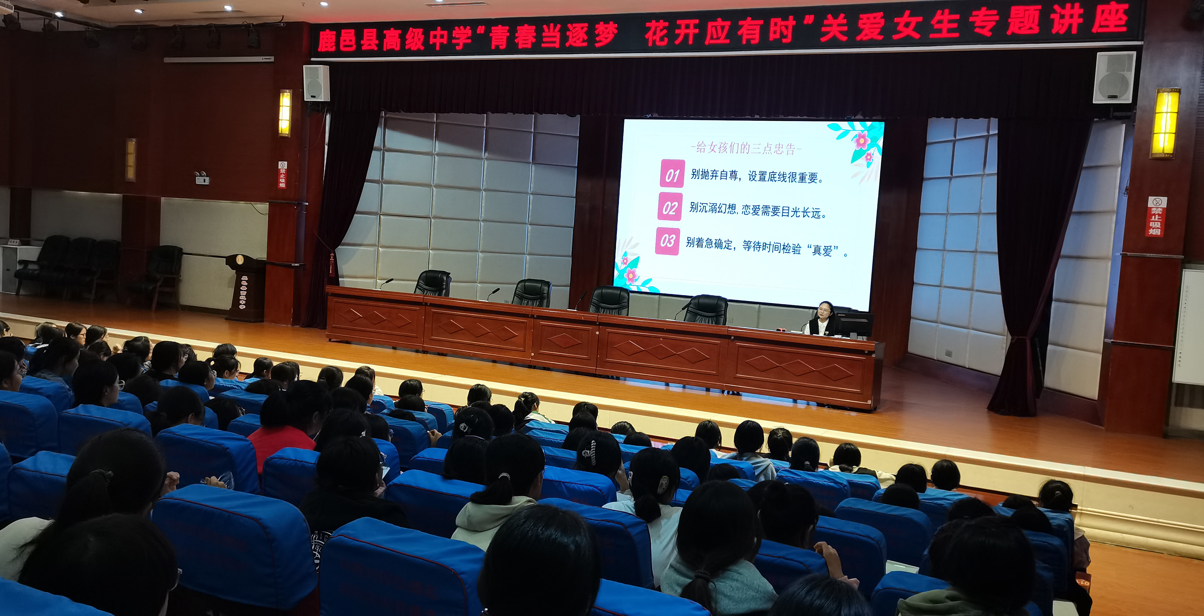 9月26日、27日晚,鹿邑縣高級(jí)中學(xué)舉行兩場(chǎng)以“青春當(dāng)逐夢(mèng),花開(kāi)應(yīng)有時(shí)”為主題的關(guān)愛(ài)女生專題講座。講座進(jìn)一步推動(dòng)學(xué)校心理健康教育工作,幫助學(xué)生提高心理健康水平,引導(dǎo)女生正確認(rèn)識(shí)青春期心理及生理上的變化,樹(shù)立積極向上的人生觀。此次專題講座由學(xué)校婦委會(huì)主任夏寧主持。