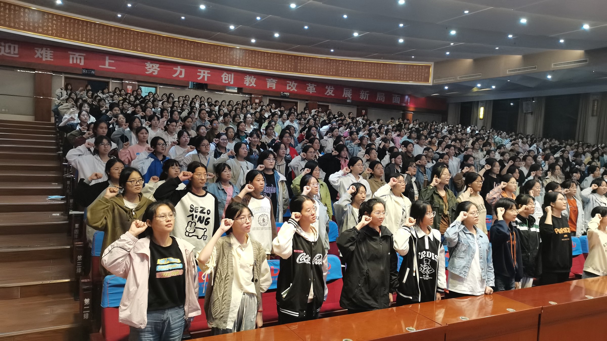 最后,在劉老師的帶領(lǐng)下全體同學(xué)舉起右拳莊嚴(yán)宣誓:做堅(jiān)強(qiáng)不屈的女生,做自強(qiáng)不息的女生,做拼搏奮斗的女生......