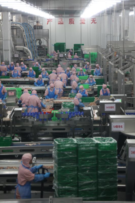 宰殺廠房的燈光比掛雞處的更暗了,除了星星點(diǎn)點(diǎn)的監(jiān)控?zé)艄猓瑤缀蹩床坏桨子鸹铍u的運(yùn)動軌跡。僅僅一步之遙,進(jìn)入打毛間和掏膛間,白羽雞進(jìn)行退毛,去頭和去爪后,等待清潔預(yù)冷和被精準(zhǔn)分割為雞腿、雞翅、雞胸肉等產(chǎn)品。