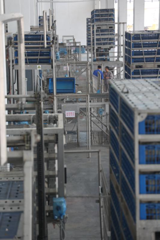 宰雞第一步先消毒,一筐筐自動分好的白羽活雞上架后即得到?jīng)_洗,“干干凈凈”地進(jìn)入下一程序——掛雞。步驟與步驟銜接中的自動化程度很高,掛雞室光線略暗?!拔覀儾捎脟H化標(biāo)準(zhǔn),宰殺環(huán)節(jié)在暗室進(jìn)行?!毕嚓P(guān)人員說。