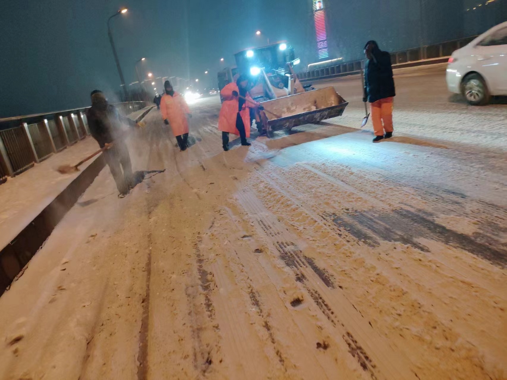 2月2日下午,為降低夜間低溫可能造成的路面結(jié)冰影響,市城管局組織人員加強對城區(qū)主要道路、橋梁等重點區(qū)域巡查,及時了解收集易結(jié)冰路段情況,各區(qū)城管組織人員車輛分班作業(yè),采取人車齊上陣,晝夜不停清理道路積雪。同時組織人工保潔力量,分布在城區(qū)各條道路上,分工協(xié)作,有條不紊,撒布融雪劑,為群眾出行安全保駕護航。