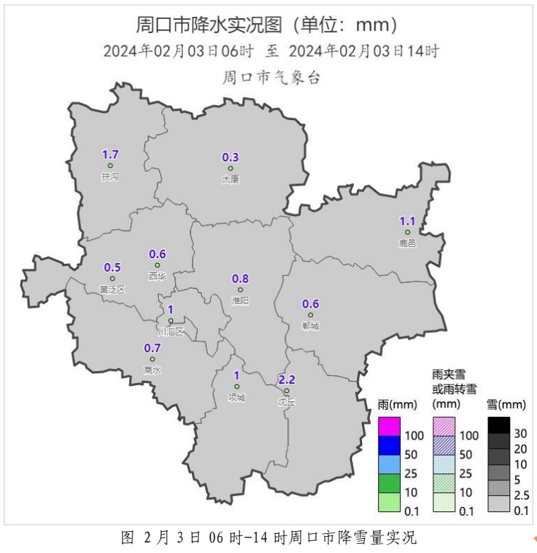 雪深:2月3日14時(shí)各縣市區(qū)雪深(厘米):項(xiàng)城8.5、沈丘8.0、西華8.0、扶溝 7.0、黃泛區(qū) 7.0、商水6.8、太康6.5、川匯區(qū)6.5、淮陽5.0、鹿邑4.0、鄲城2.4。
