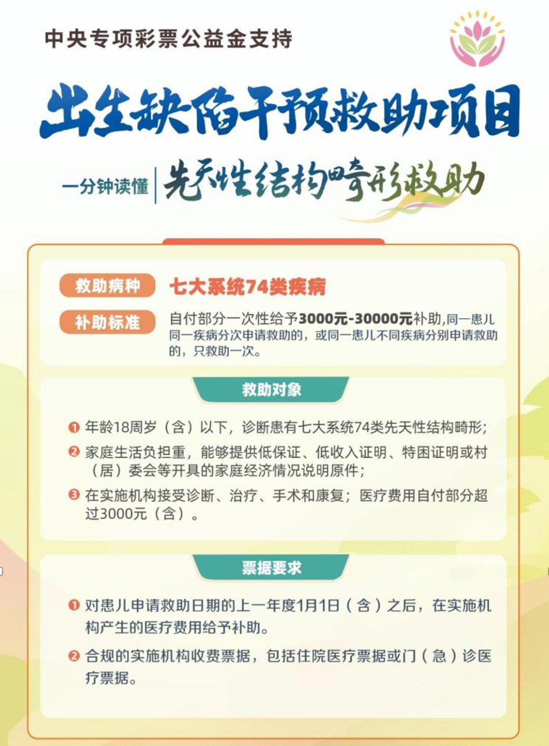 中央專項(xiàng)彩票公益金支持出生缺陷救助項(xiàng)目,旨在向患有遺傳代謝病、先天性結(jié)構(gòu)畸形和功能性出生缺陷等三類出生缺陷疾病的經(jīng)濟(jì)困難家庭提供醫(yī)療費(fèi)用補(bǔ)助,減輕患兒家庭醫(yī)療負(fù)擔(dān)。該項(xiàng)目由衛(wèi)生健康委委托中國(guó)出生缺陷干預(yù)救助基金會(huì)組織實(shí)施。