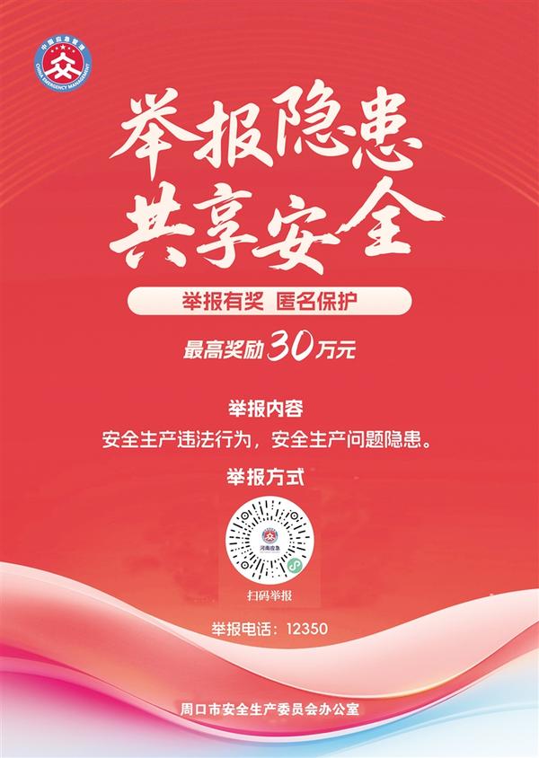 周口市安全生產(chǎn)委員會辦公室以舉報電話、掃碼舉報等方式,受理群眾舉報安全生產(chǎn)非法違法行為線索。一經(jīng)查實,我們將依據(jù)《河南省安全生產(chǎn)領(lǐng)域舉報獎勵實施辦法》相關(guān)規(guī)定,對舉報人予以獎勵,最高獎勵金額30萬元。我們將對舉報人個人信息進行嚴格保密,依法保護舉報人的合法權(quán)益。